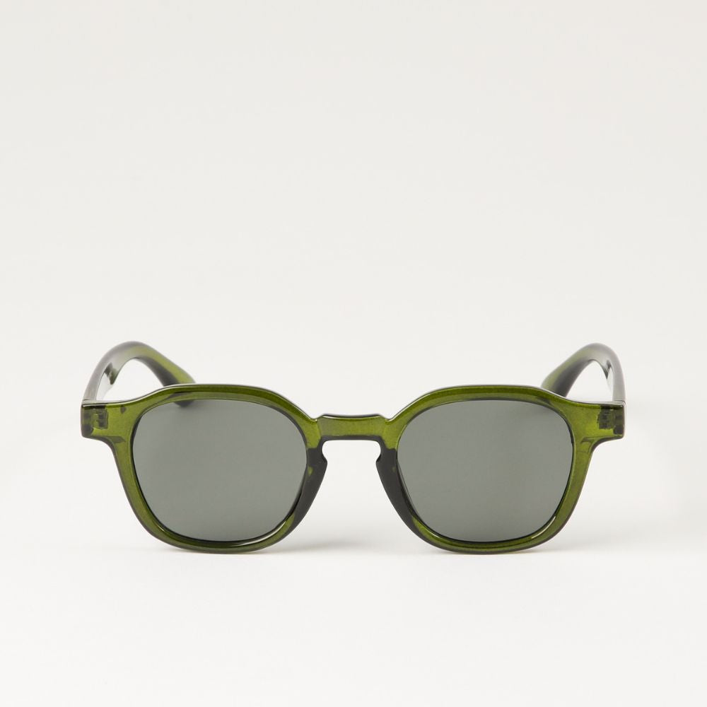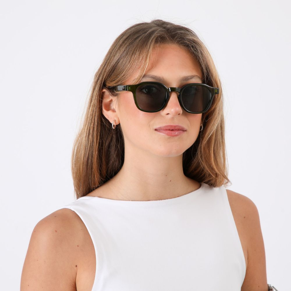 Anteojos de sol estilo "pantos" geométrico con montura verde semitransparente y lente negro verdoso con filtro 400 UV.