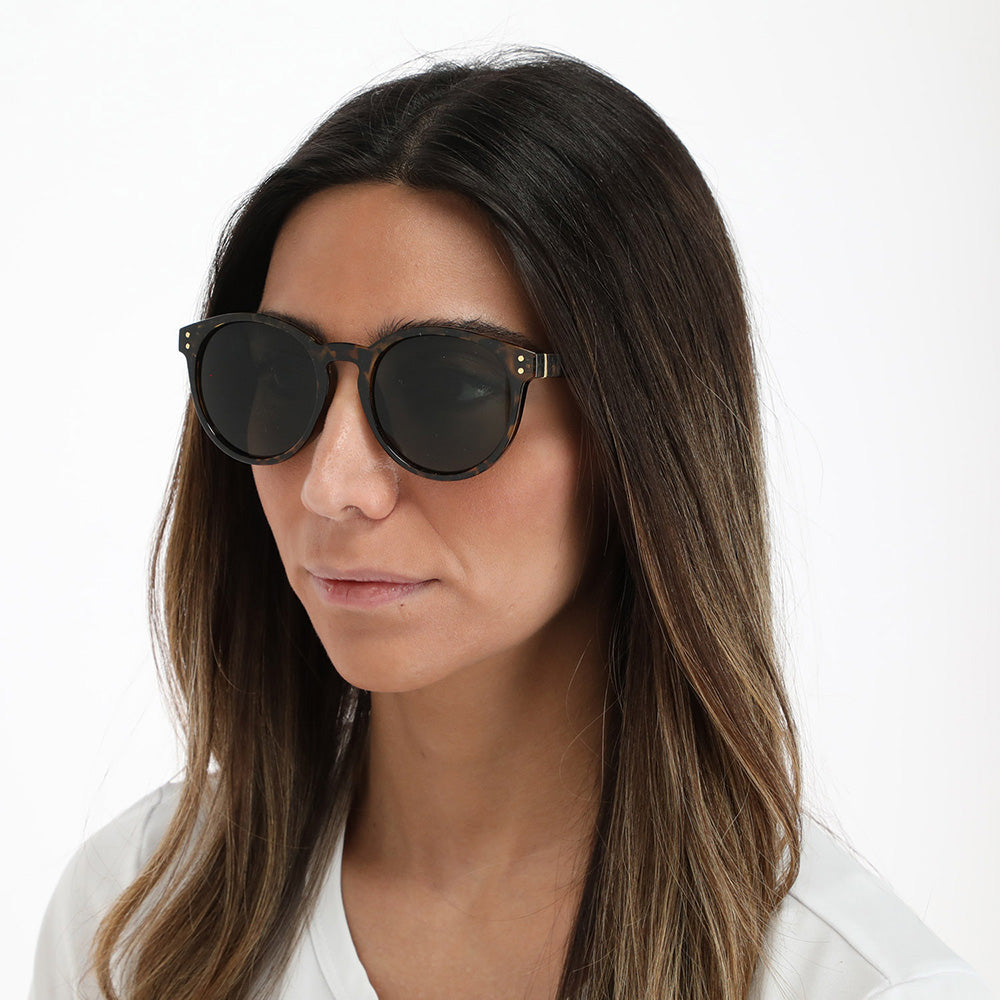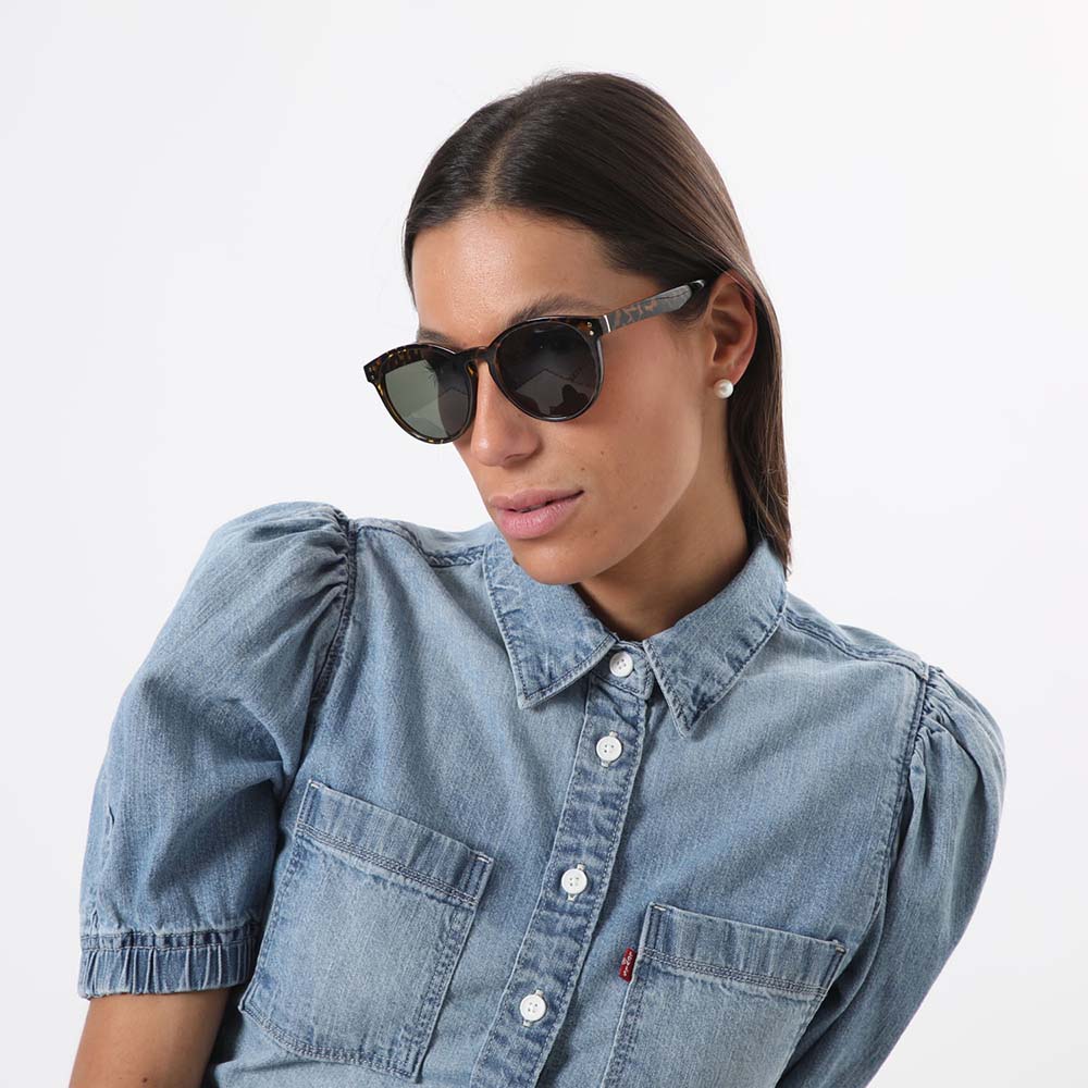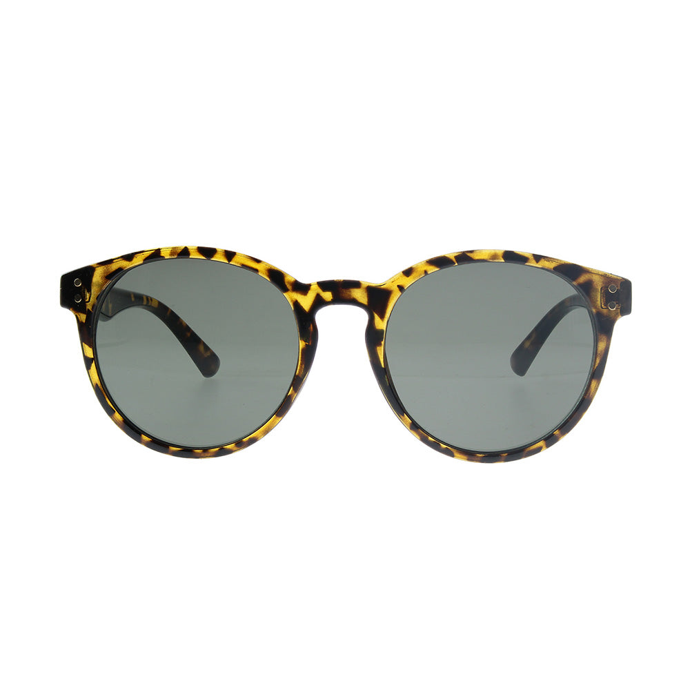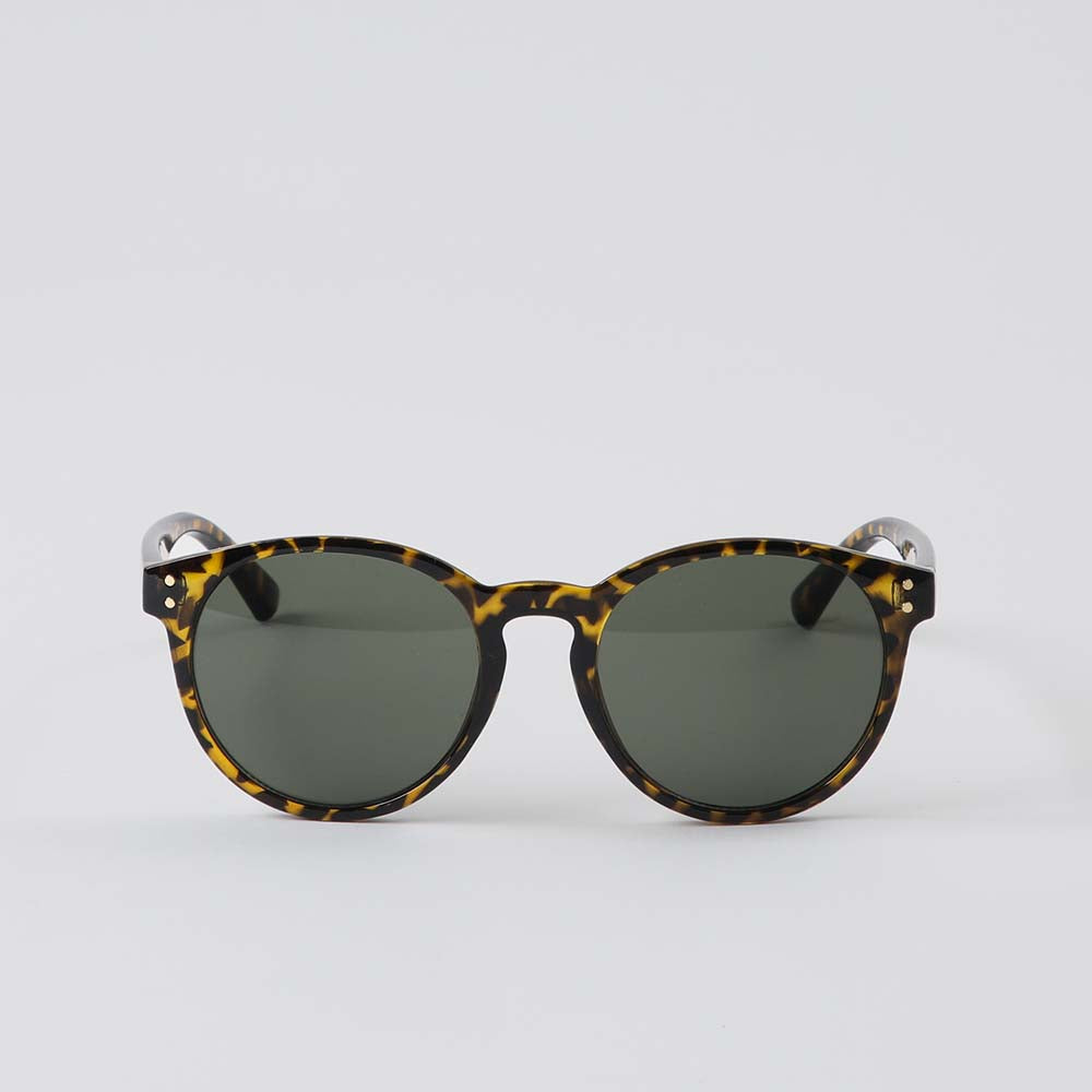 Anteojos Sol i-D Paula de color café. Anteojos de sol de amrco redondo con manchas en tonos negros, café y amarillo y lentes verdes.