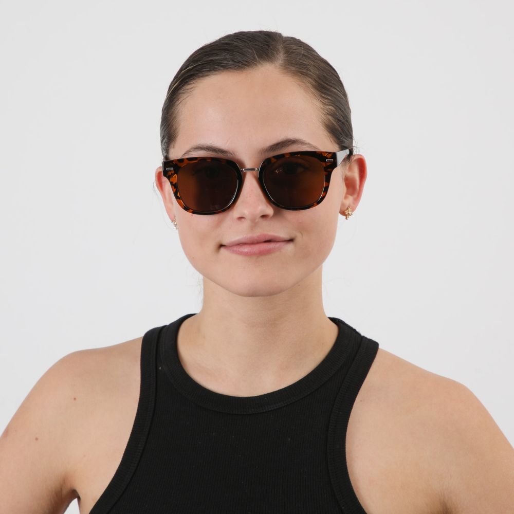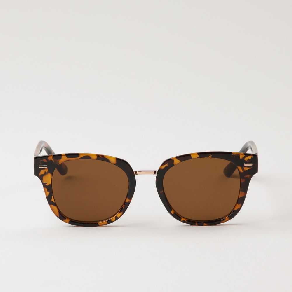Anteojos de sol estilo "wayfarer"con montura en acabado carey semitransparente en tonos café con negro. Puente y detalle de rectángulos sobre esquinas superiores en metal plateado. Lentes cafés con filtro 400 UV.