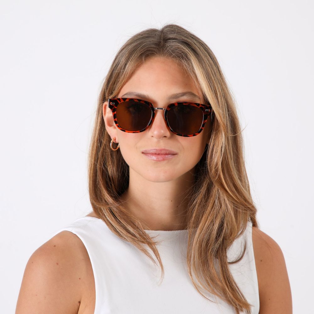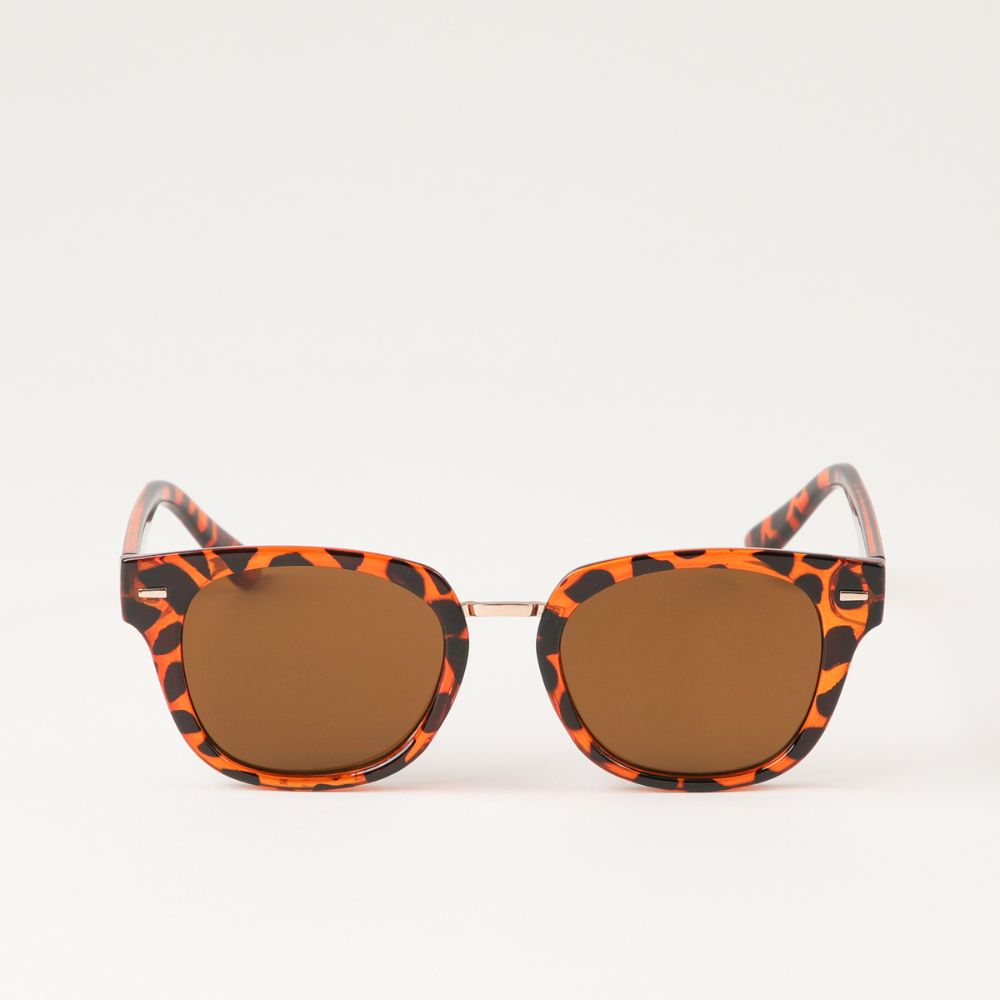 Anteojos de sol estilo "pantos"/"clubmaster" con montura en acabado carey de tonalidades cafés con detalle de rectángulos sobre esquinas superiores y el puente en metal rosegold. Lente café con filtro 400 UV