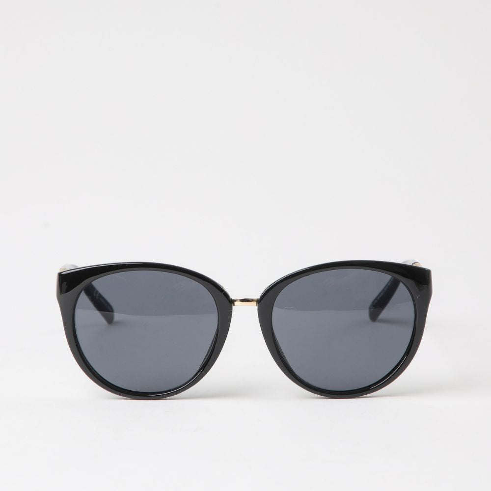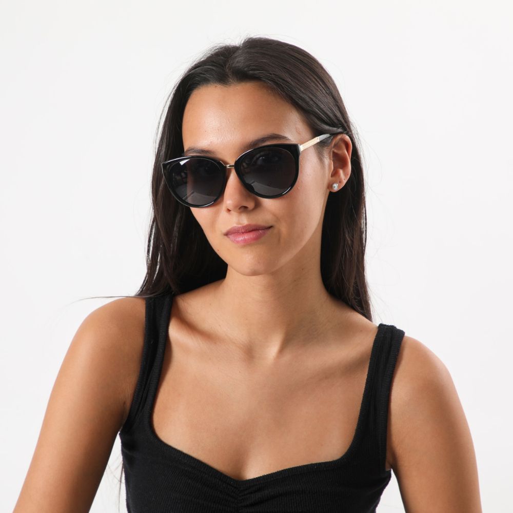 Anteojos de sol Pamela Black estilo "squova" con marco negro y detalle de trenza sobre metal dorado en sus patas. Lente en color negro.