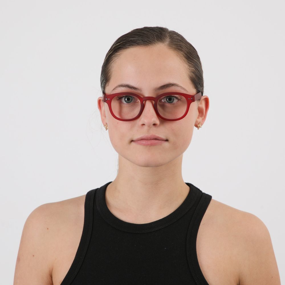 Anteojos de lectura con montura estilo "wayfarer" en color rojo oscuro. Cuenta con 1.0, 1.5, 2.0, 2.5 y 3.0 de aumento.