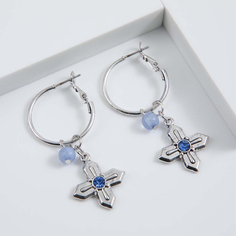 Argollas iD Goa plateadas. Argollas con colgante d epiedra y cruz.