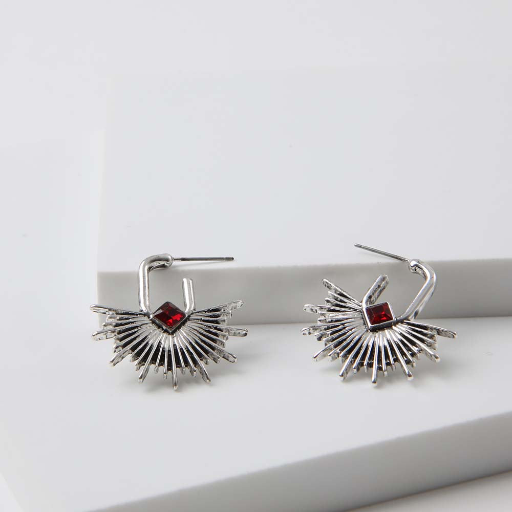Argollas plateadas. Tienen un ovalo con una pieza de rayos y Piedra brillante de fantasía en la parte inferior