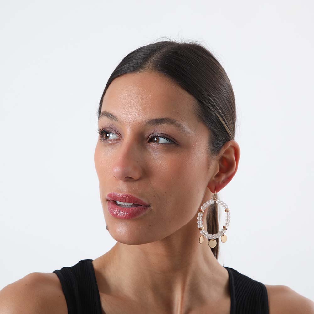 Aro Argolla i-D Maragogi de color blanco. Son un par de aros colgantes con una argolla colgando con mostacillas blancas y charms circulares dorados.