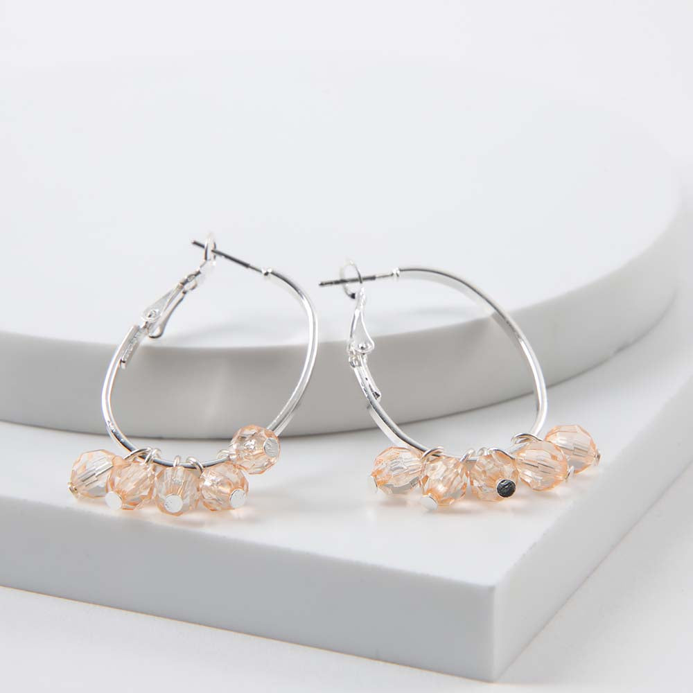 Estas argollas plateadas tiene colgando cinco mostacillas de vidrio facetadas de color naranjo.