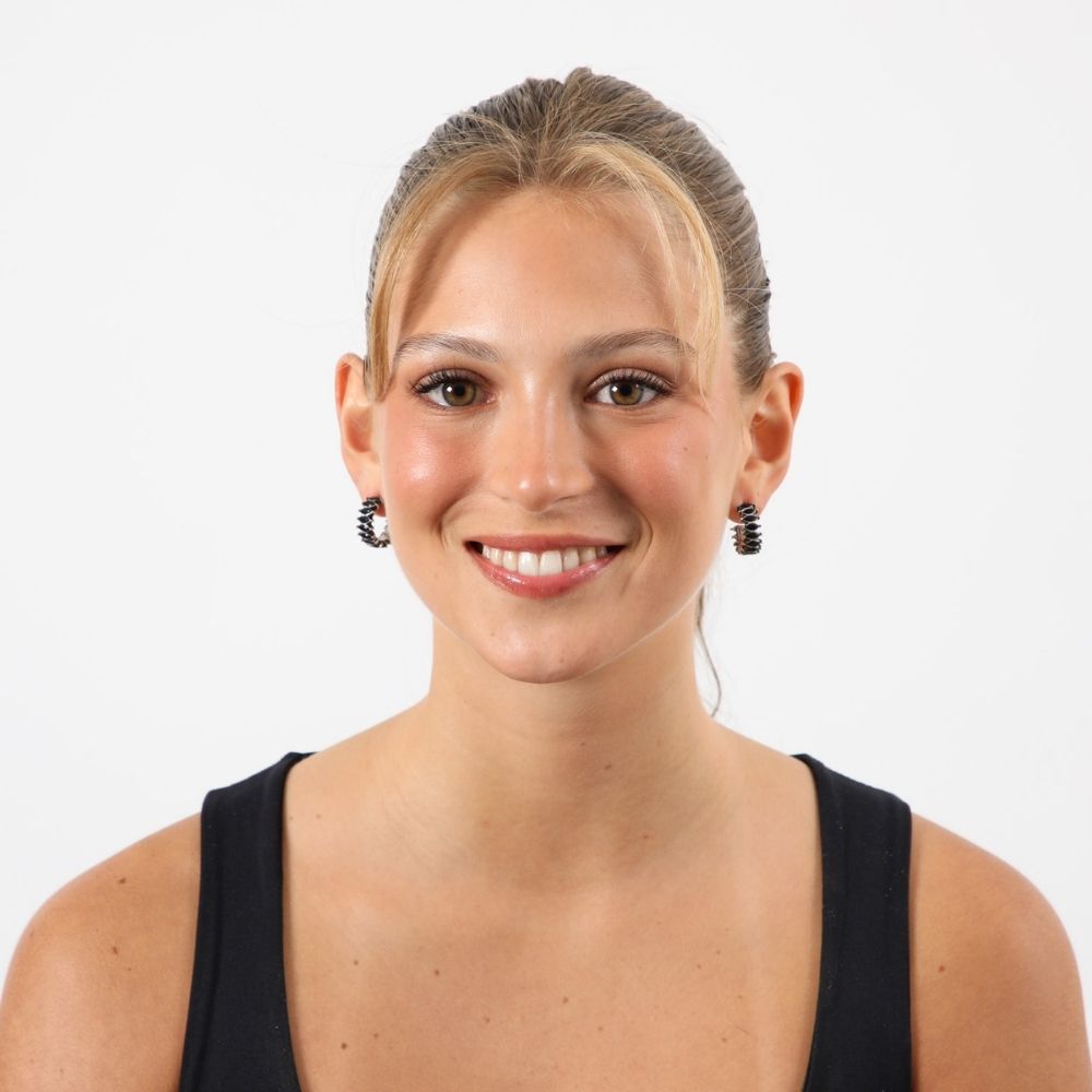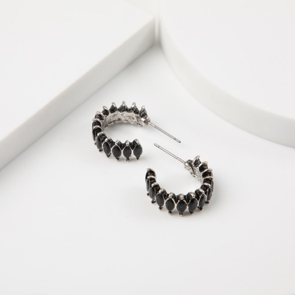 Aros tipo argolla gruesa plateada con brillantes de fantasía negros.