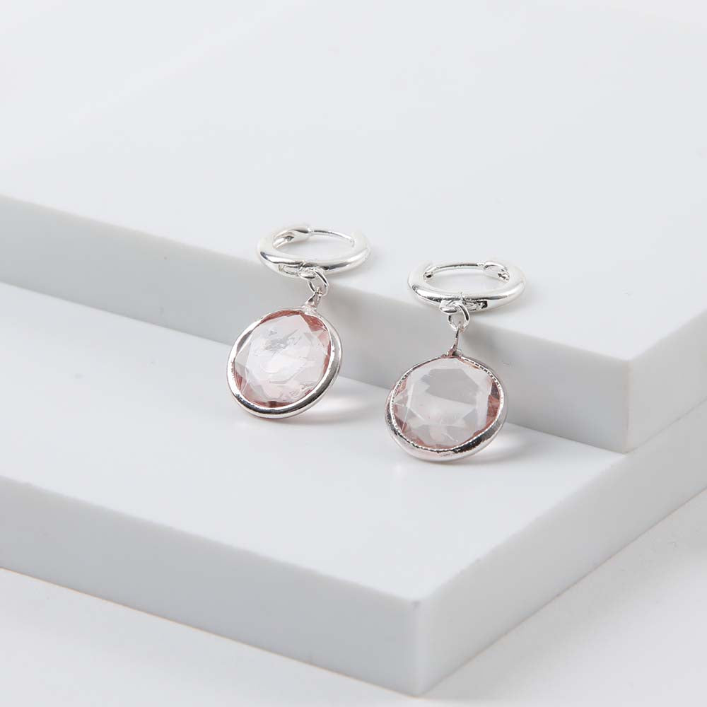 Argollas plateadas lisas con una mostacilla de vidrio transparente plana color morado.