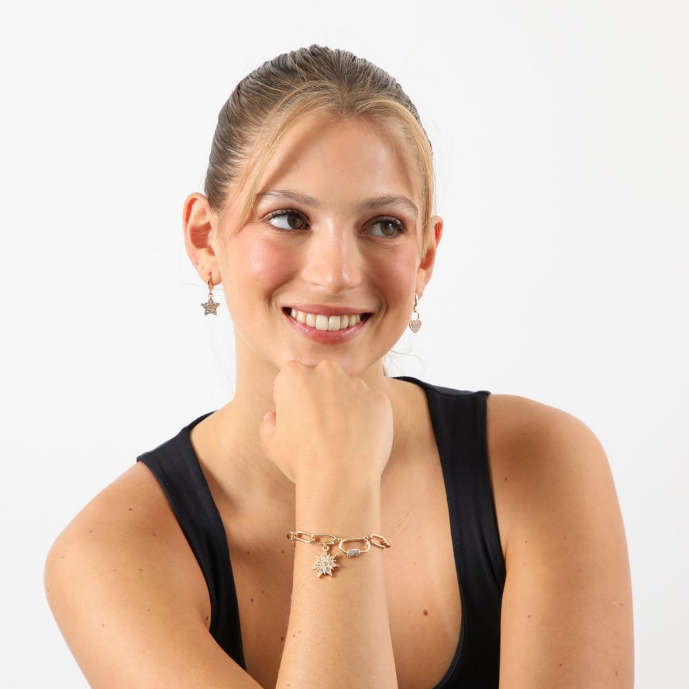 Aros de argolla dorados con dije de corazón y estrella con brillantes de fantasía.