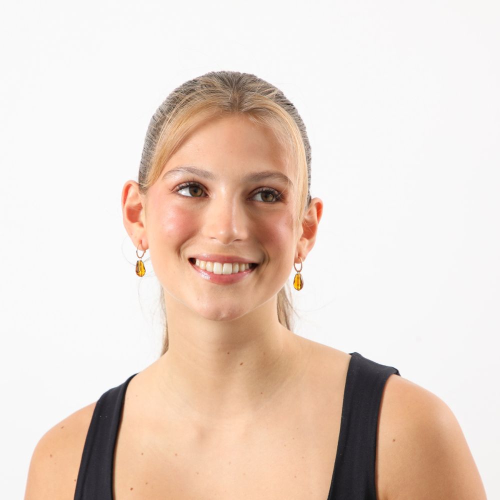 Aros tipo argollas pequeñas lisas con mostacilla semitransparente ambar colgando.