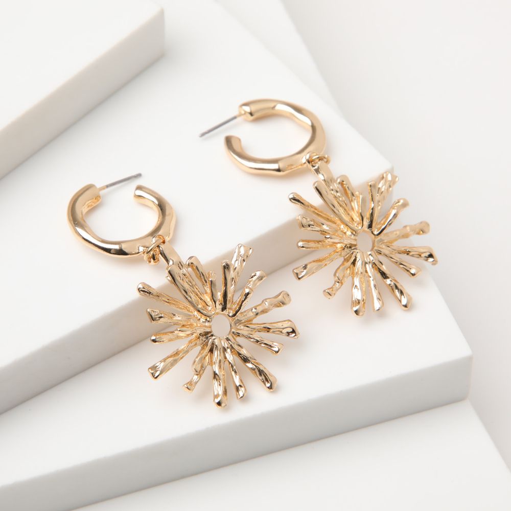 Aros dorados tipo argolla mediana, gruesa y con textura irregular con circunferencia colgando compuesta por puntas irregulares.