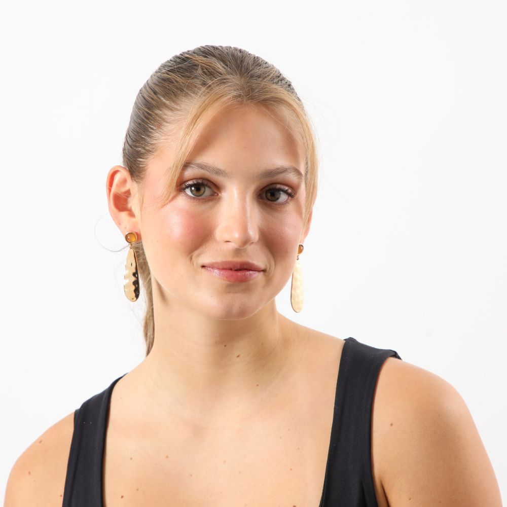 Aros largos de piedra de fantasía semitransparente naranja con placa metalica ovalada colgando.