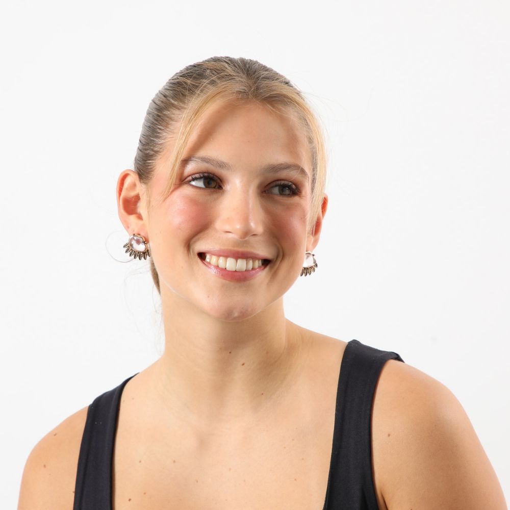 Aros pegados de piedra de fantasía semitransparente rosado pálido con detalles de hojas metálicas por un costado.
