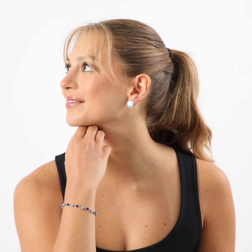 Aros pegados pequeños de piedra de fantasía blanca circular rodeada por brillantes de fantasía celestes.