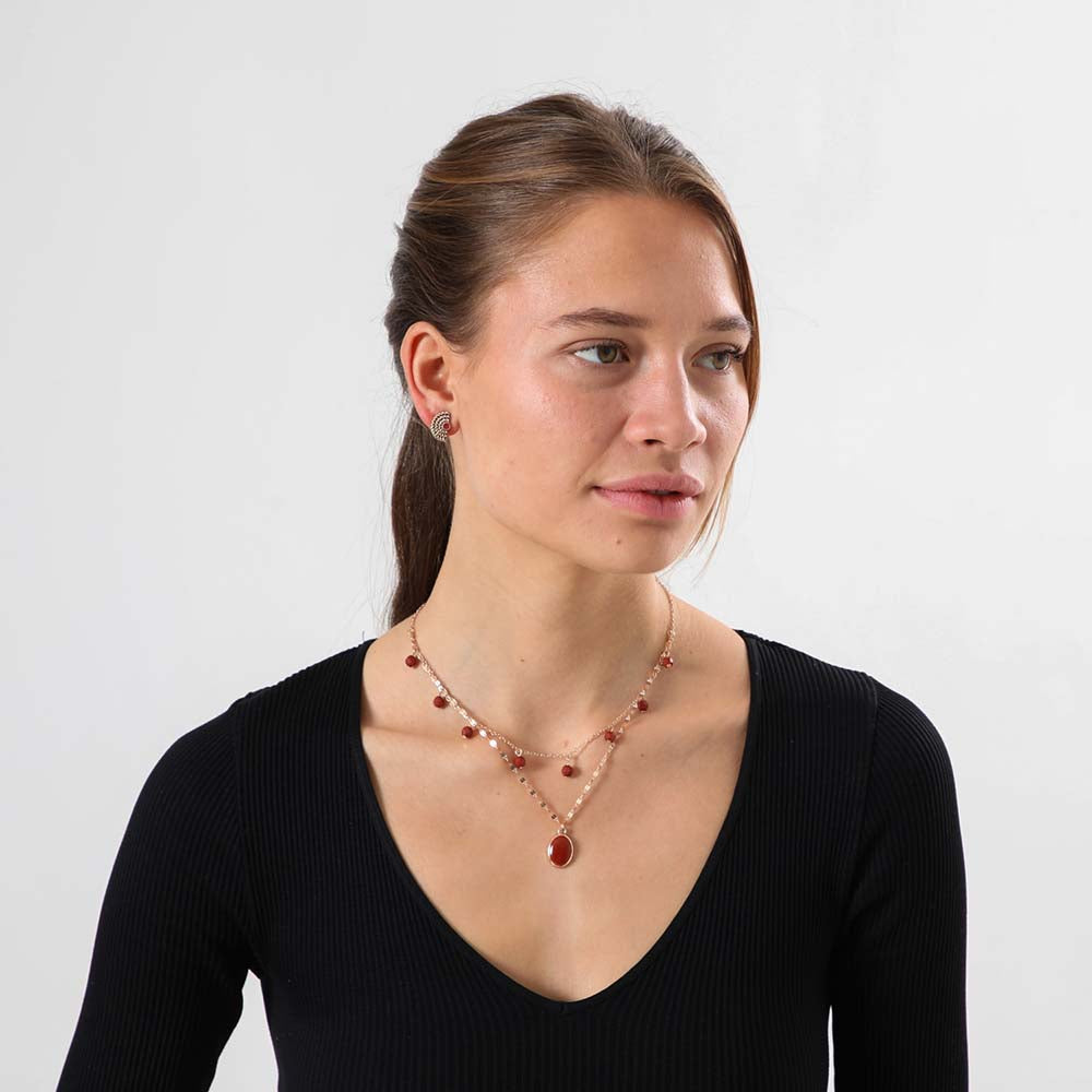 Aros dorados semicurculares con textura trenzada. Tienen un circulo en color café en el centro. Estos aros tienen un mecanismo de cierre clip por lo que no es necesario tener perforaciones para utilixarlos.