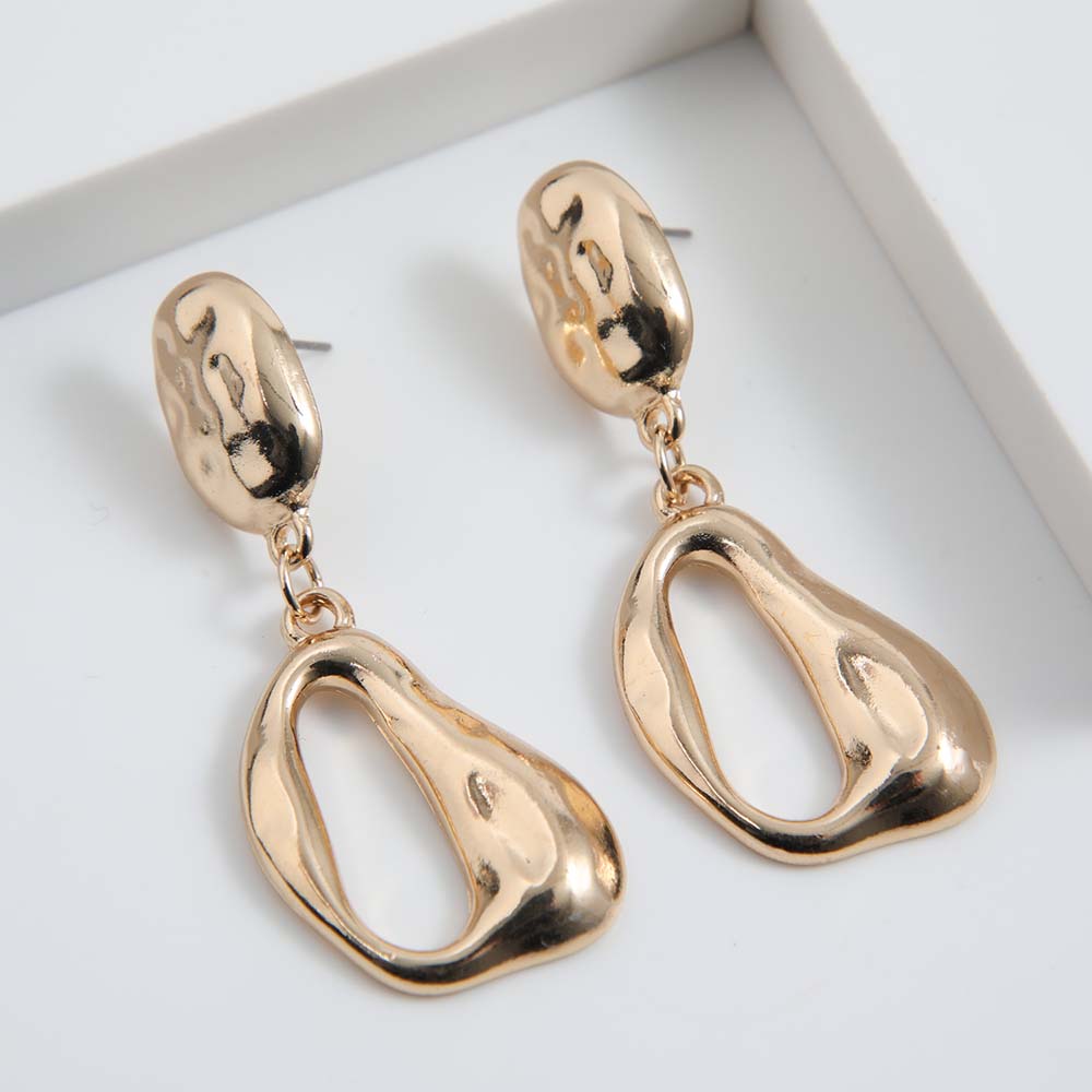 Aro Largo i-D Andrea de color dorado. Aros colgantes con base ovalada de la que se desprende una figura irregular.