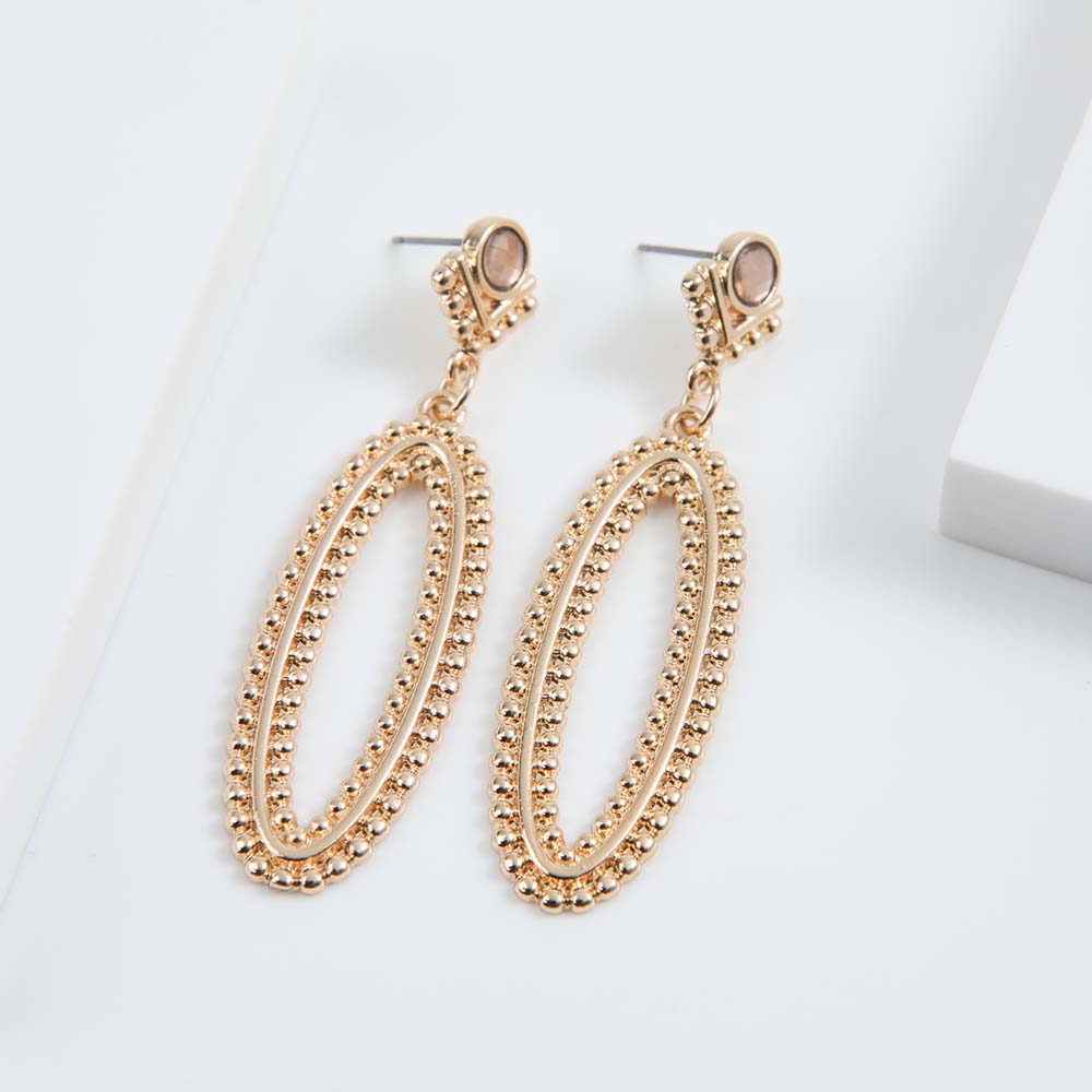 Aro largo i-D Artem de color dorado. Aros colgantes con base de cristal de fantasía del que se desprende una figura ovalada con pequeñas esferas.