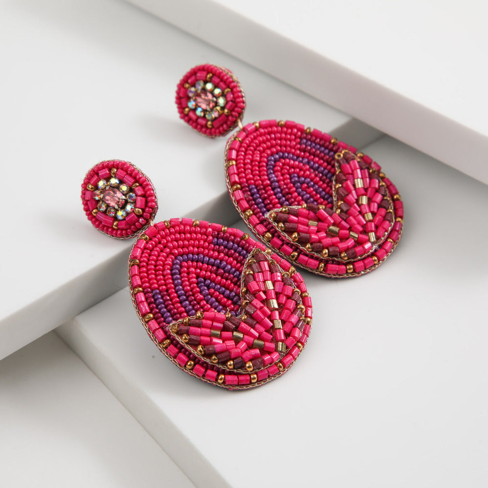 Aro colgante redondo doble con piedras de fantasía y mostacillas rosadas, moradas y doradas.