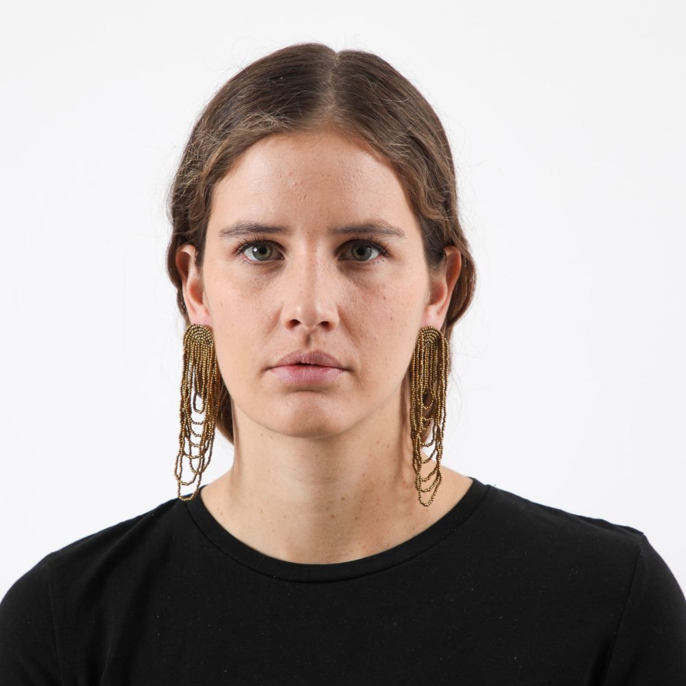 Aro largo compuesto con argollas de diferentes largos en mostacillas doradas redondas.