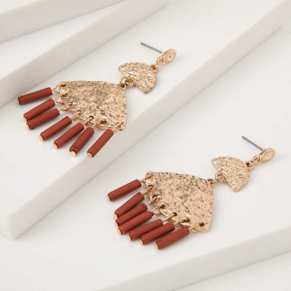 Aros largos de tres partes, un óvalo pequeño, medio círculo y un triángulo curvo. El borde inferior del triángulo lleva mostacillas rojas tubulares colgando.