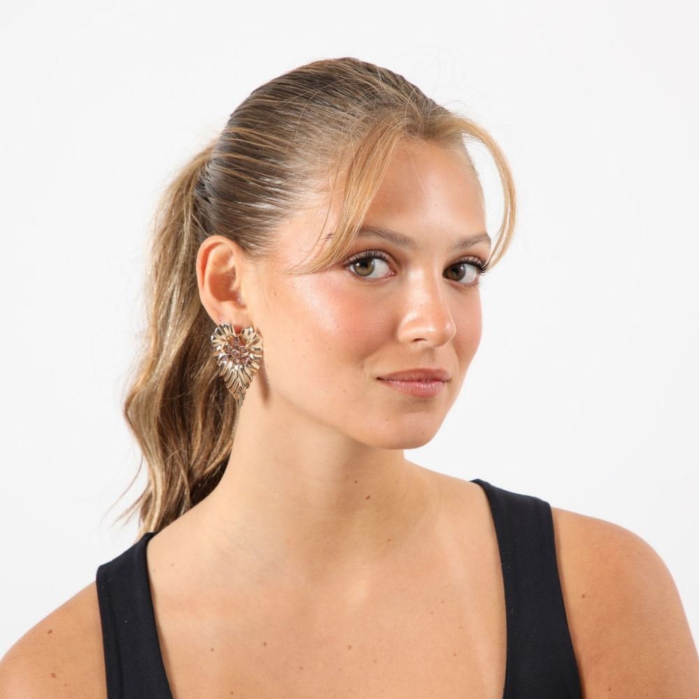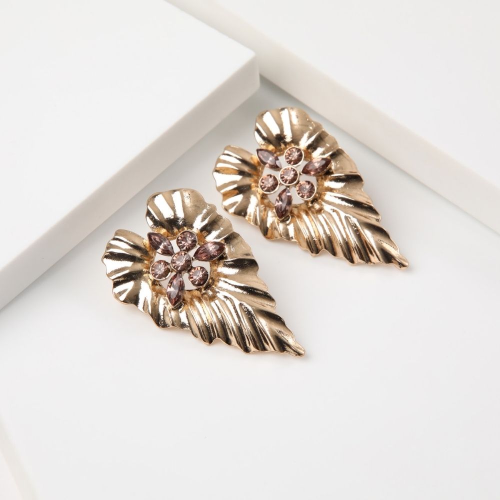 Aros pegados grandes dorados con forma de hojas con brillantes de fantasía color lila