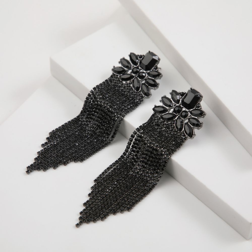 Aros largos plateados con brillantes de fantasía en forma de hoja y geométricos negros sobre semicículos con flecos de cadenas de brillantes de fantasía cuadrados pequeños negros.