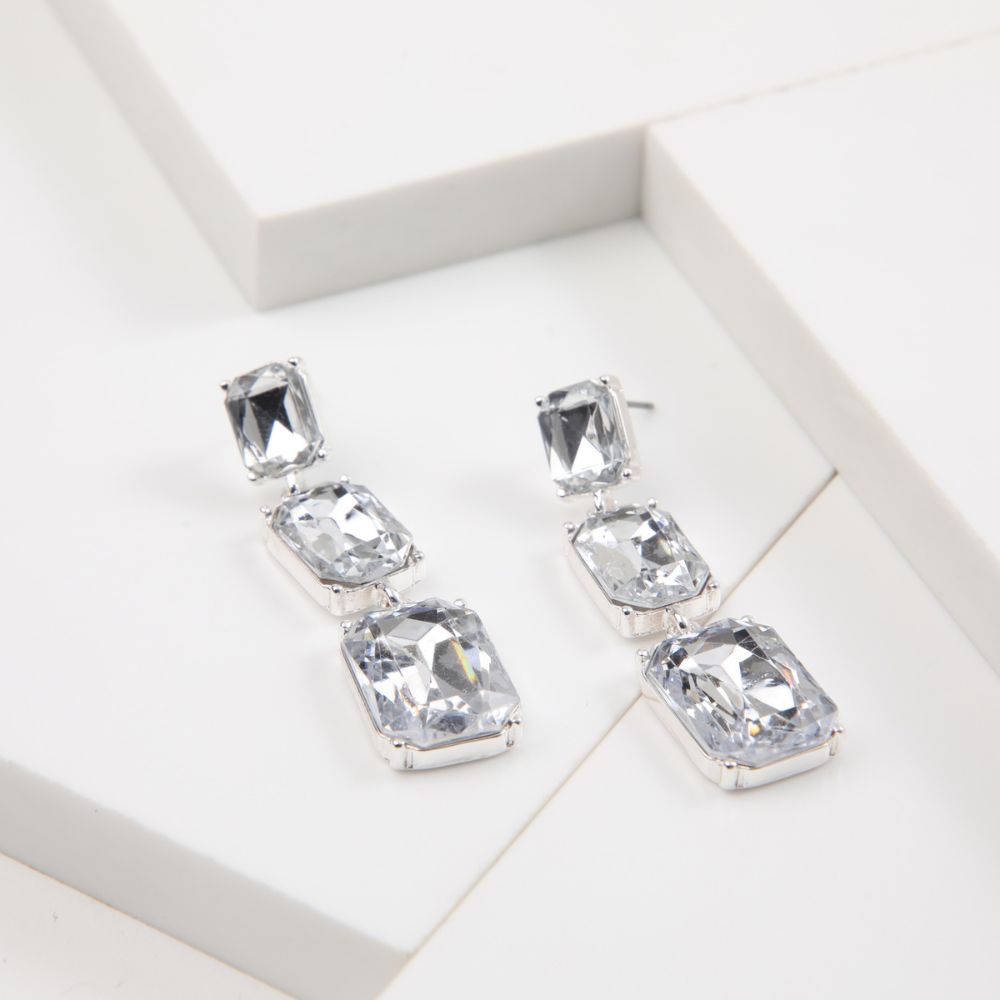 Aros largos plateados de 3 brillantes de fantasía celestes rectangulares.