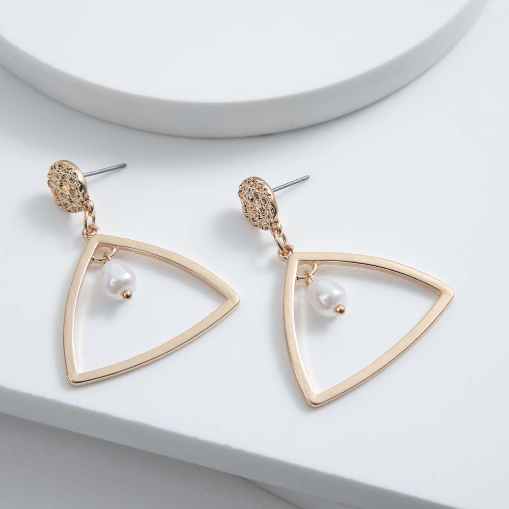 Aro Largo i-D Bondi de color dorado. Aros colgantes con base circular texturada de la que se desprende un triangulo dorado y una perla de fantasía.