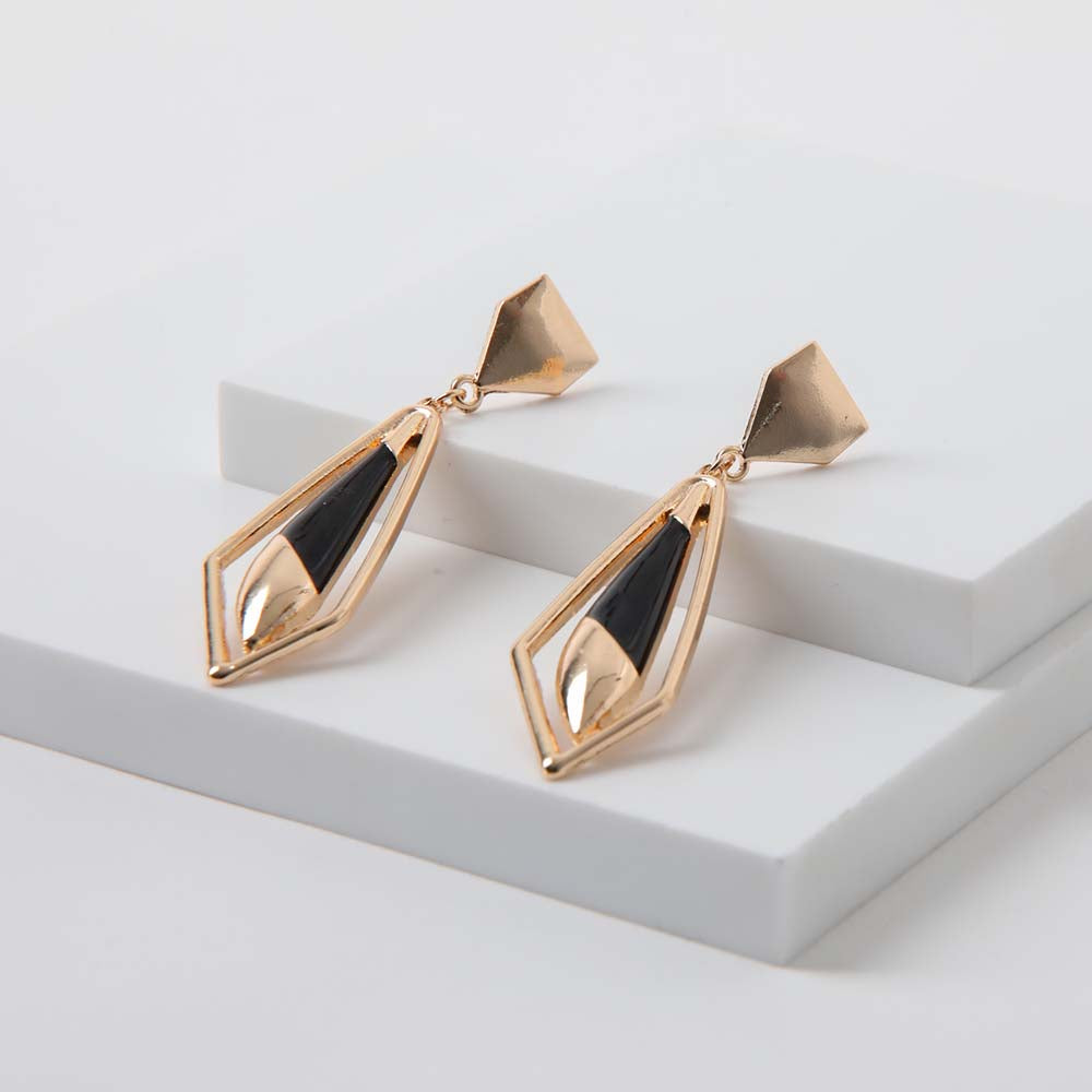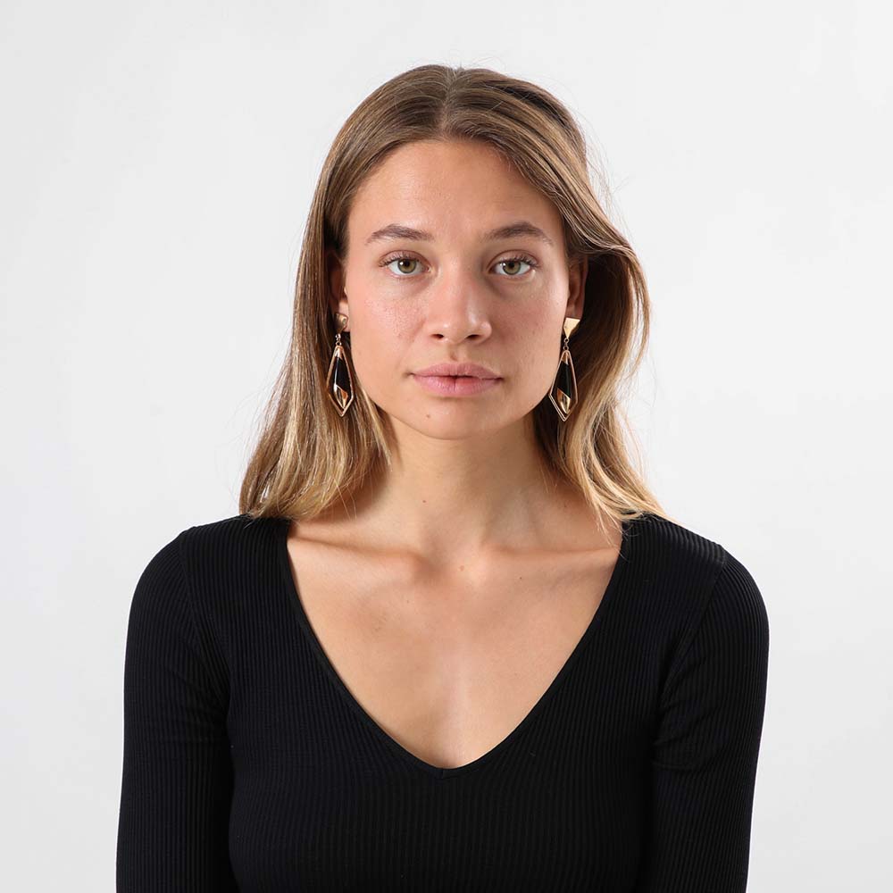 Aros colgantes con base de triángulo dorado de la que se desprende una figura geométrica dorada con detalles negros.