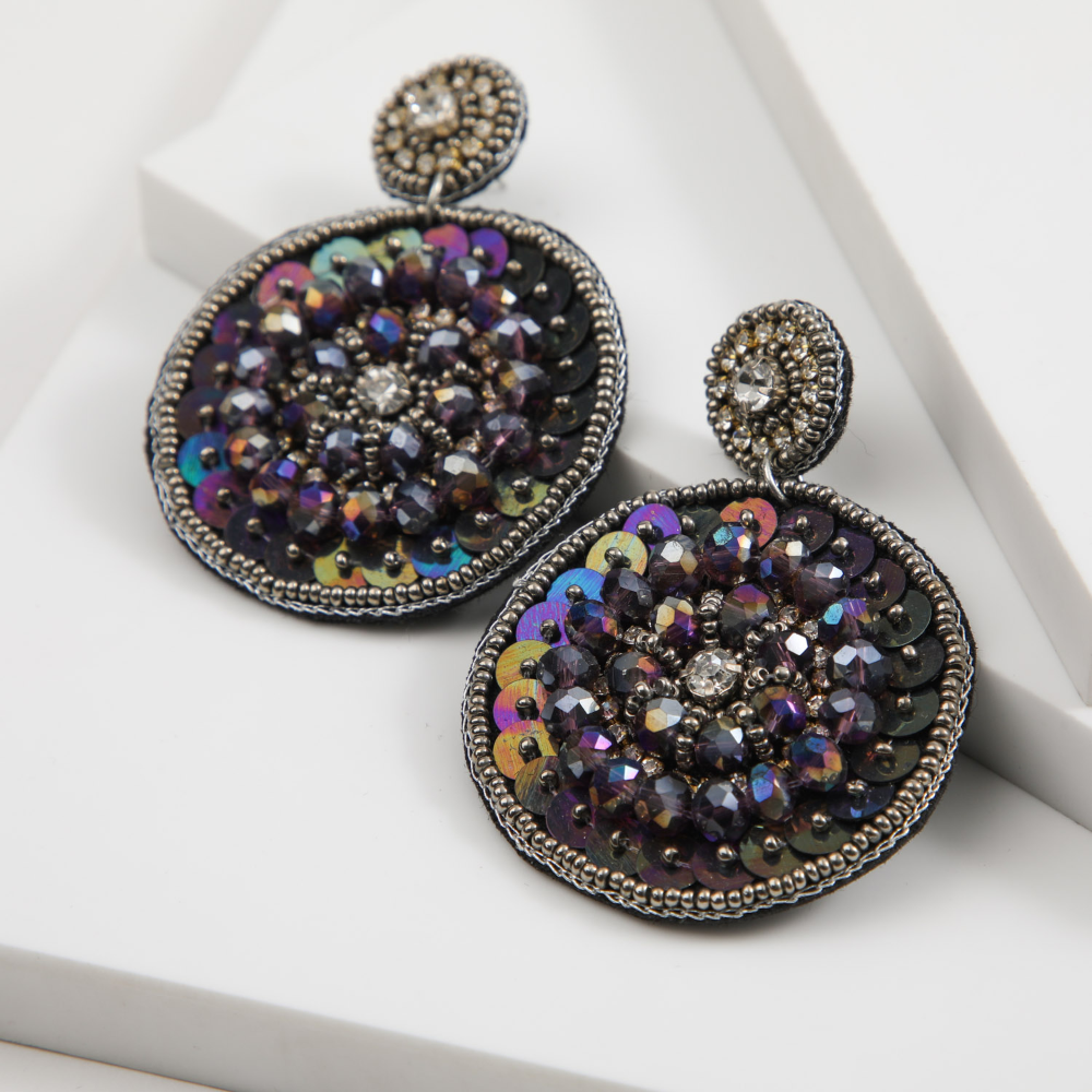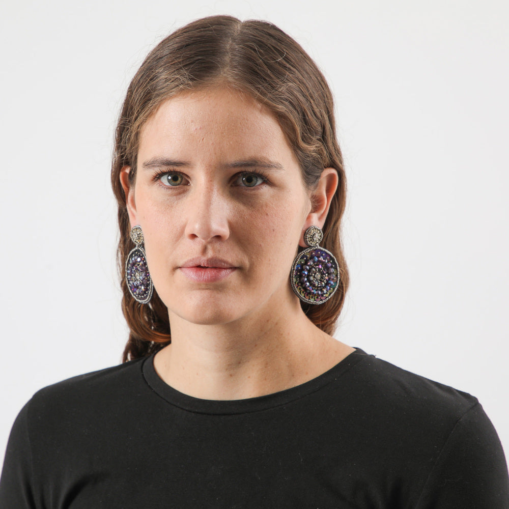Aro largo doble redondo, con brillantes de fantasía, mostacillas plateadas y tornasol azules, y lentejuelas azules.