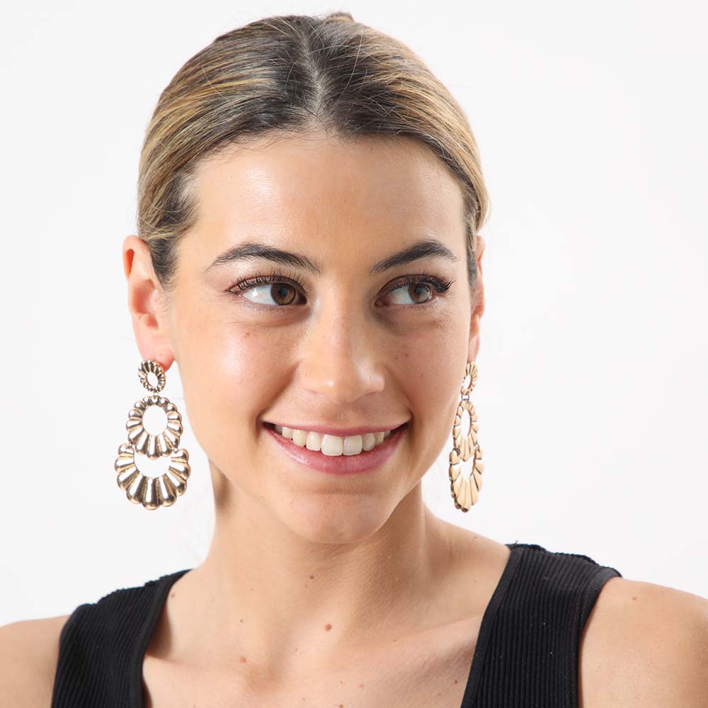 Aro Largo i-D Content de color dorado. Es un par de aros colgantes con formas florales, la base son los petalos de una flor pequeña de la que cuelga la misma figura en mayor tamaño, de esta cualga la mitad de la misma figura.