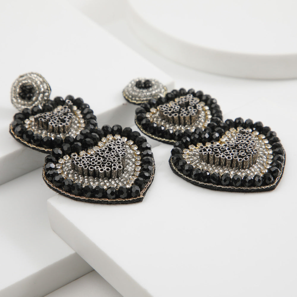 Aro largo doble corazón de mostacillas negras, transparentes y plateadas con brillantes de fantasía.