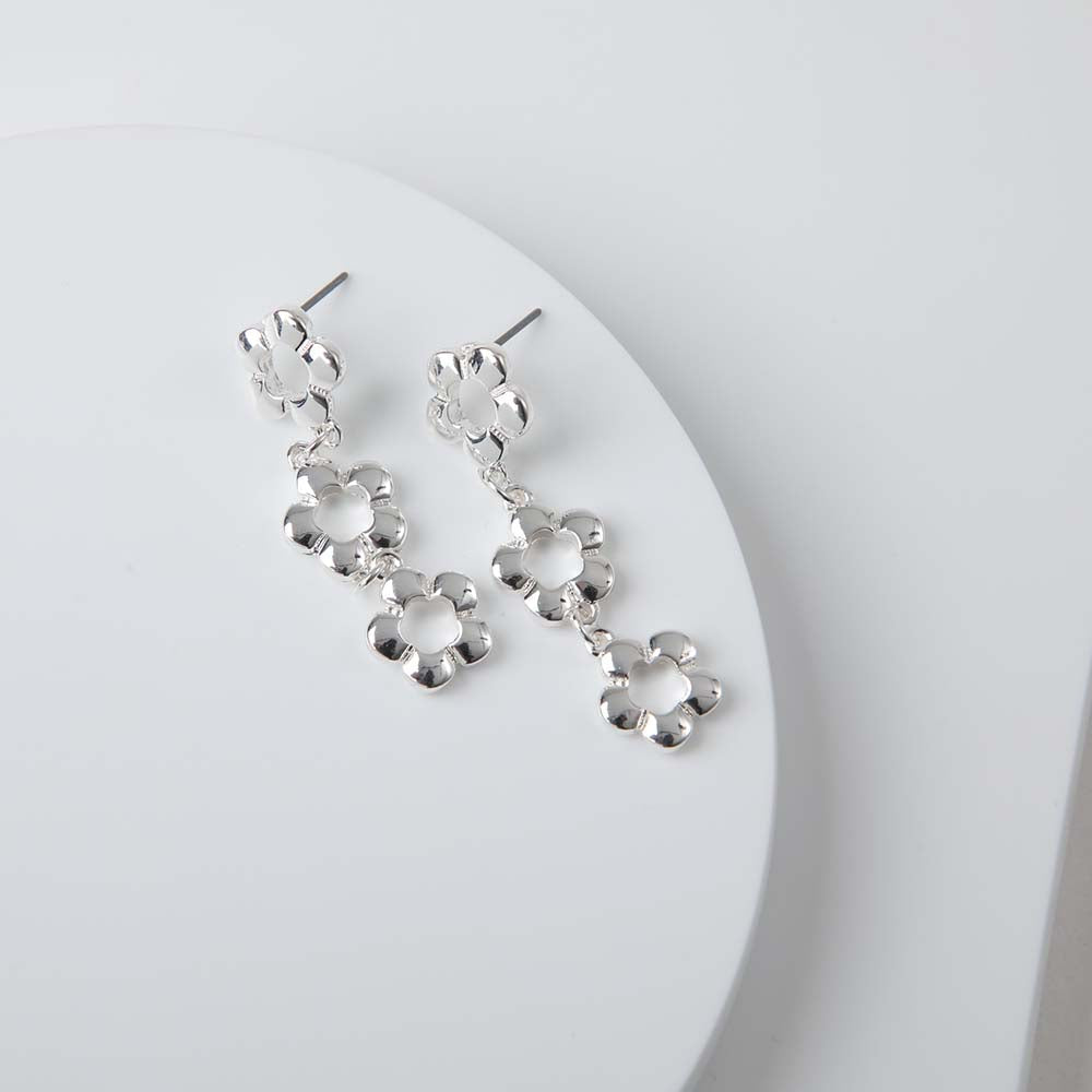 Aro Largo i-D Dawn de color plateado. Este aro esta compuesto por tres flores plateadas unidas consecutivamente entre ellas por argollas pequeñas