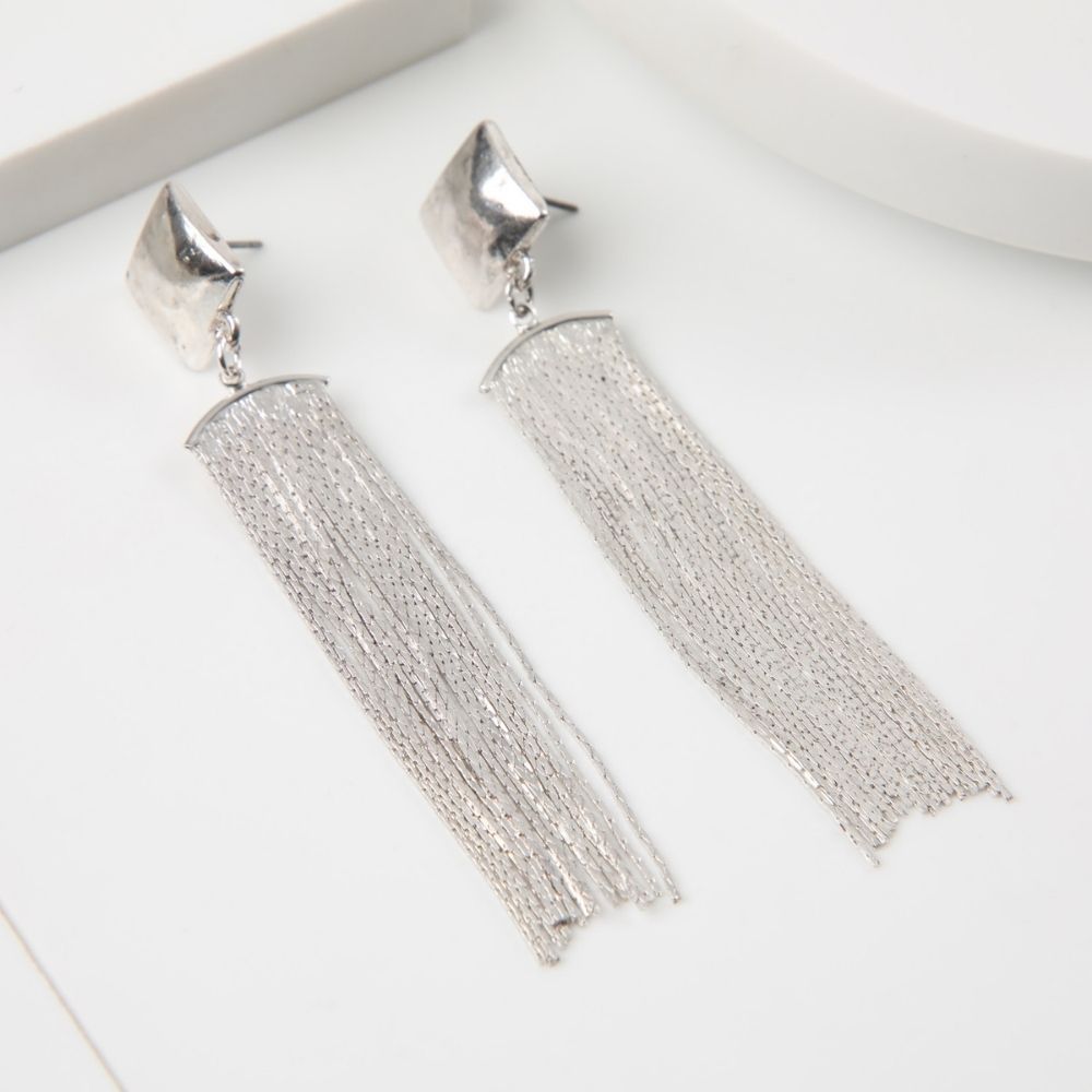 Aros largos con forma cuadrada y cadenas colgantes plateados.