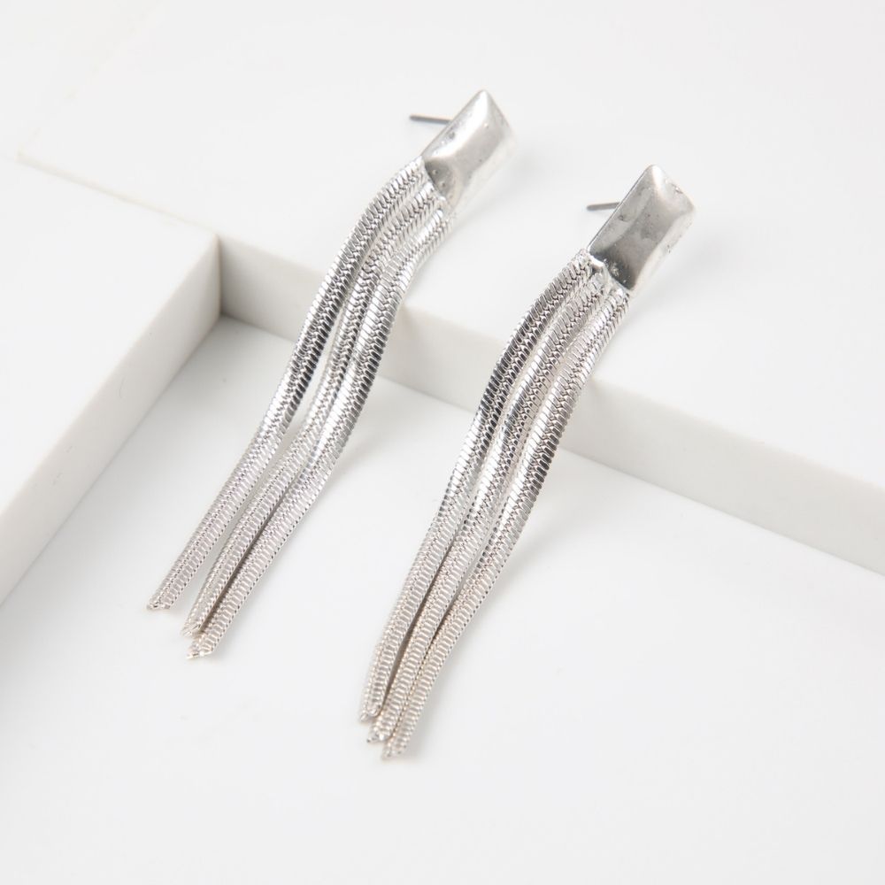 Aros con base rectangular plateado con cadenas colgantes largas.