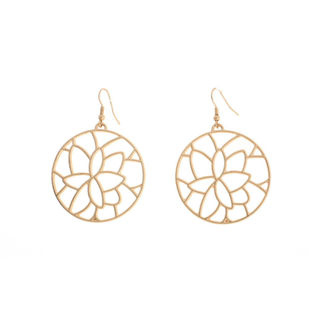 Aro Largo Essential Olimpia, tipo colgante de gran tamaño con un diseño que simula una flor. A pesar de su tamaño, su estilo y diseño son ideales para lucir con todo tipo de tenidas, sobre todo las más casuales y llamativas.