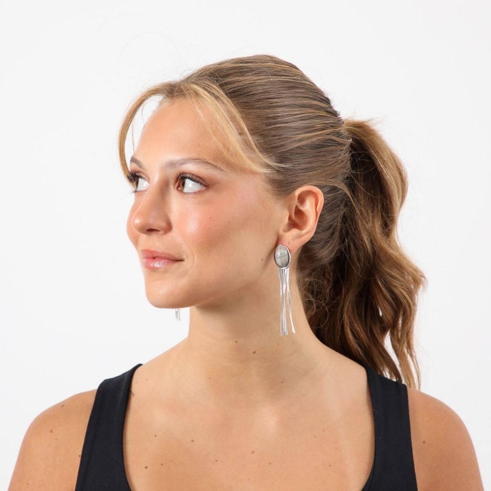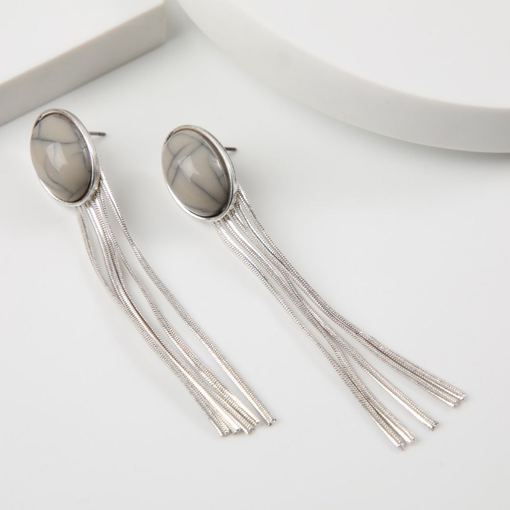 Aros largos colgantes con mostacilla gris verdoso marmolado con cadenas colgantes