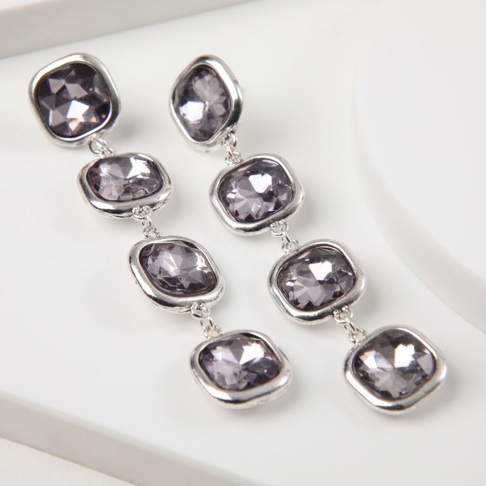 Aros colgantes largos plateados con brillantes de fantasía color lila.