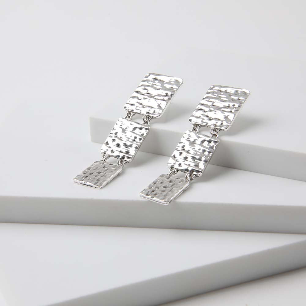 Aros colgantes plateados compuesto por piezas cuadradas con efecto amartillado