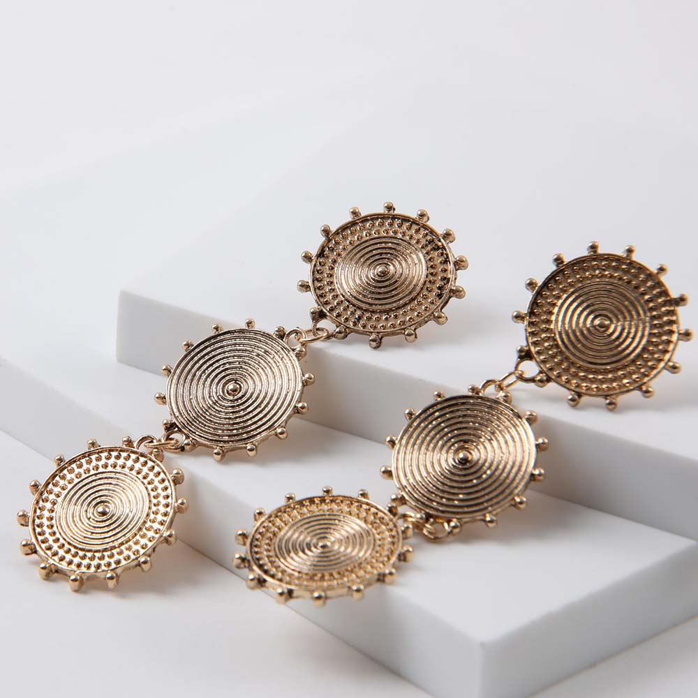 Aros colgantes compuestos de 3 circunferencias. Estas tienen texturas circulares con pequeños detalles en los bordes.