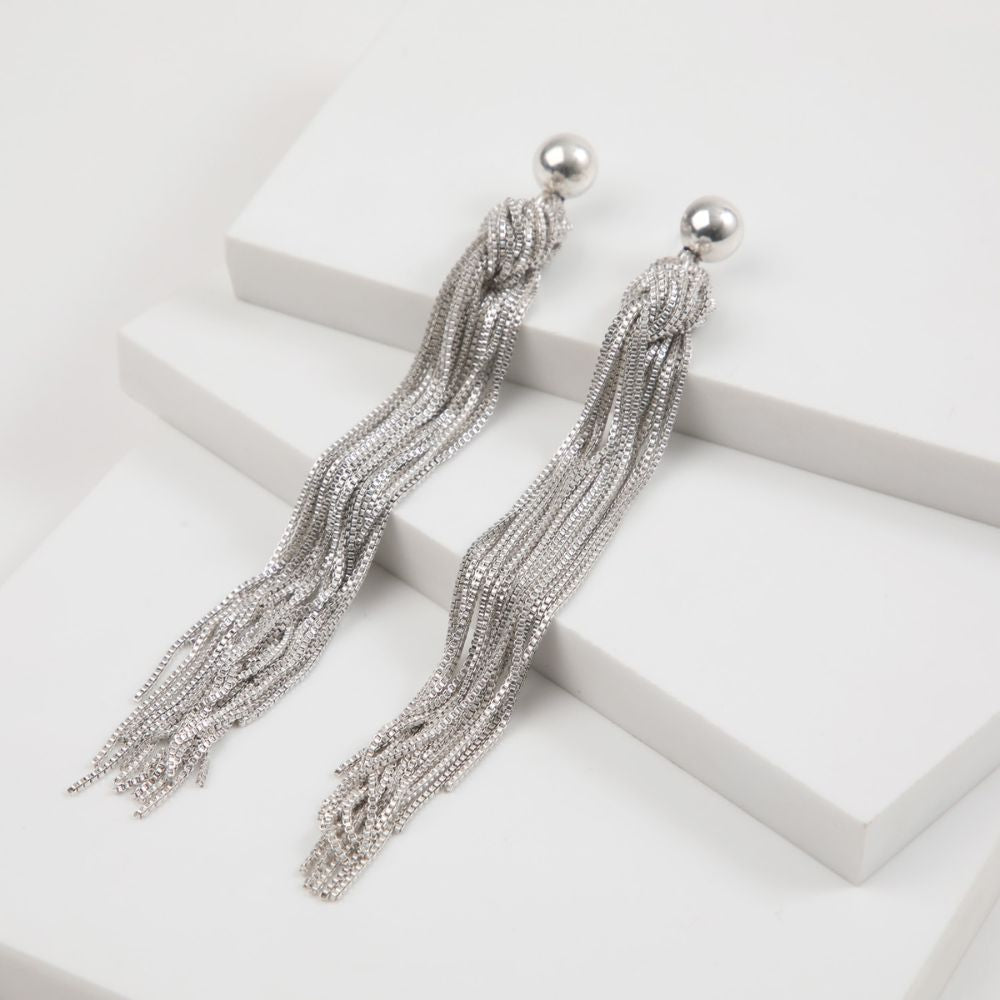 Aros largos plateados de círculo con nudo de cadenas terminadas en flecos.