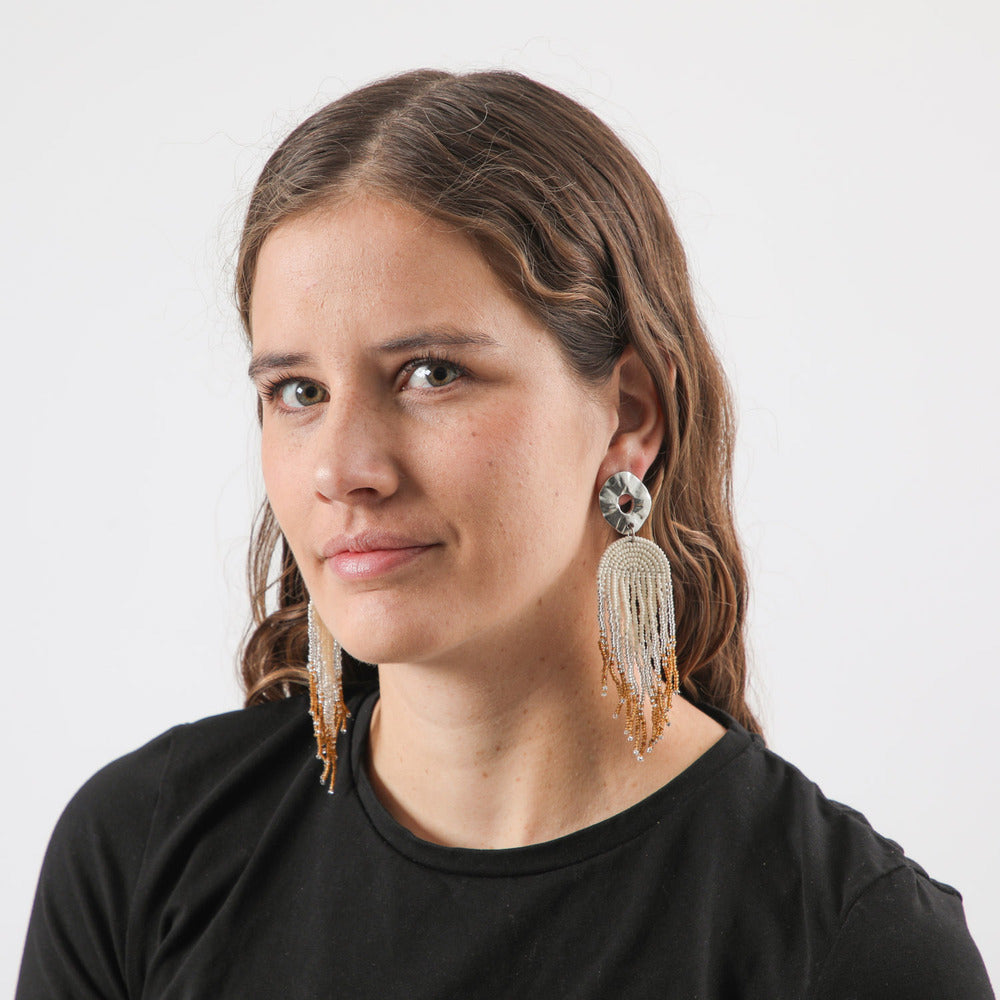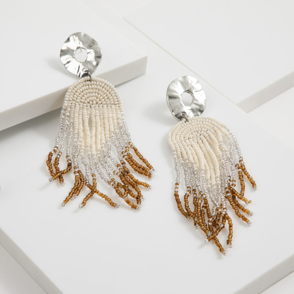 Aro largo de base redonda metalica plateada texturada, con fleco redondo de mostacillas blancas, plateadas y café.