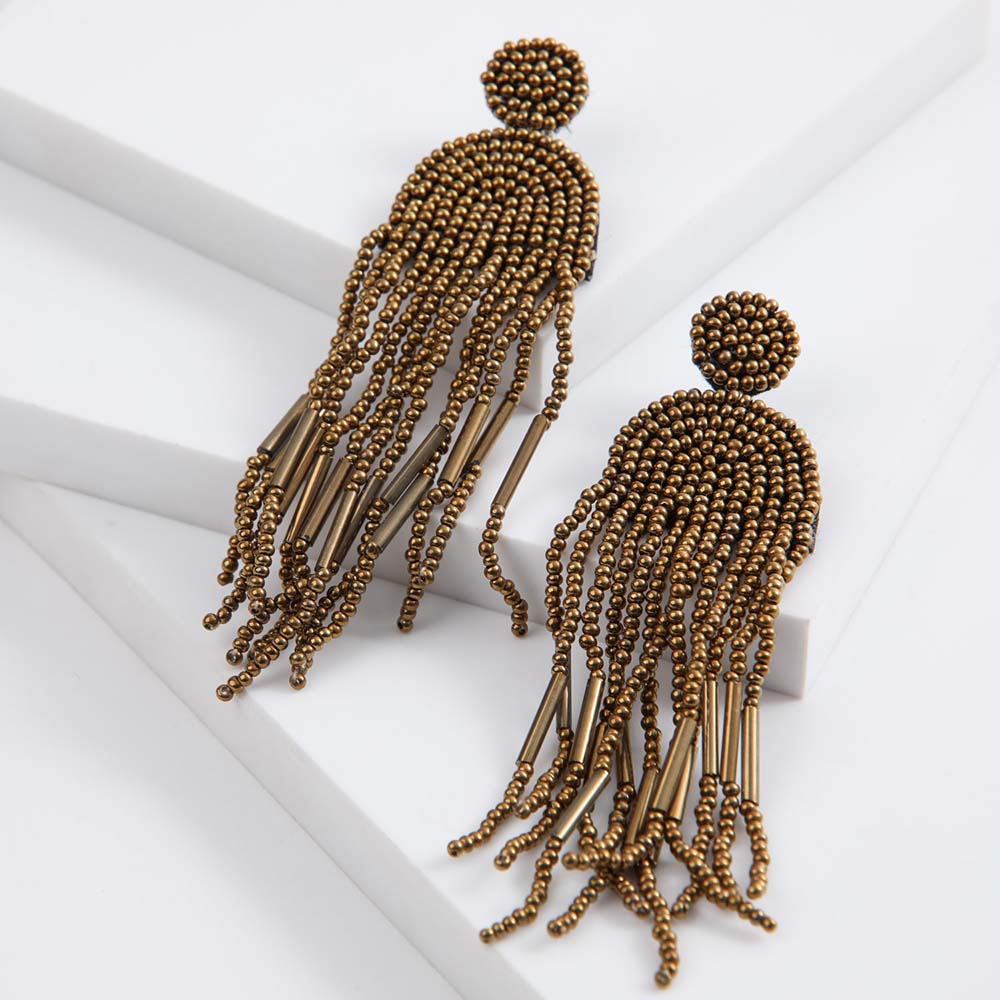 Aro formado por un semi circulo y tiras en Mostacillass de vidrio en color dorado.