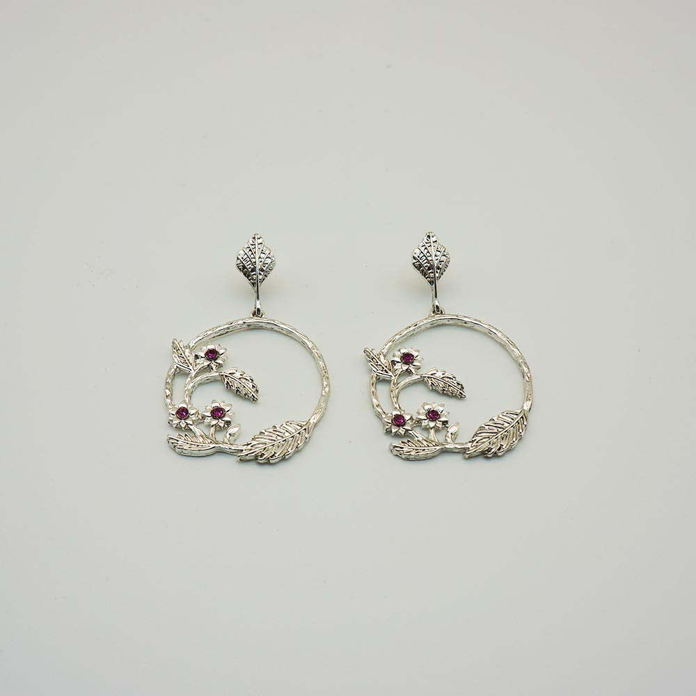 Aros Tatienne Girasol largos plateados. Argolla con enrredadera con flores que tienen rheinstones rosados al centro.