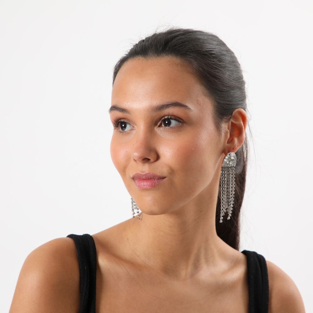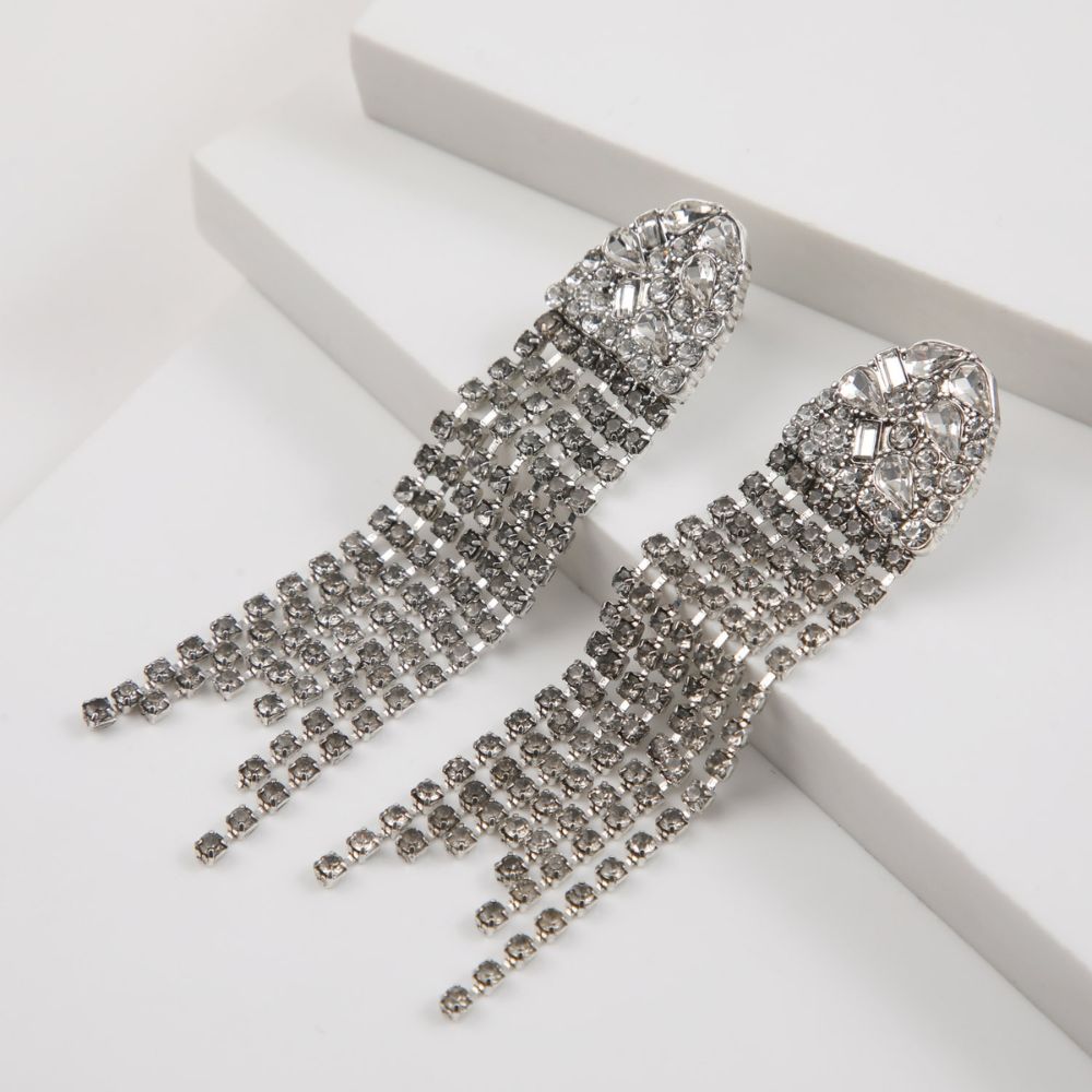 Aros largos plateados con brillantes de fantasía en forma de gota y geométricos blancos sobre semióvalo con flecos