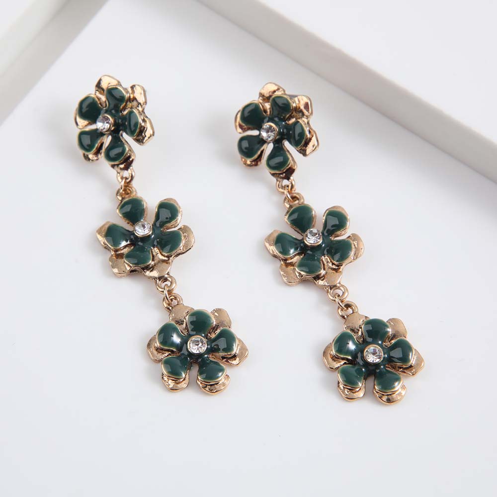 Aro Largo Tatienne Imbali de color verde. Es un aro colgante compuesto por tres flores con acabados verde y un brillante de fantasía al centro de cada una.