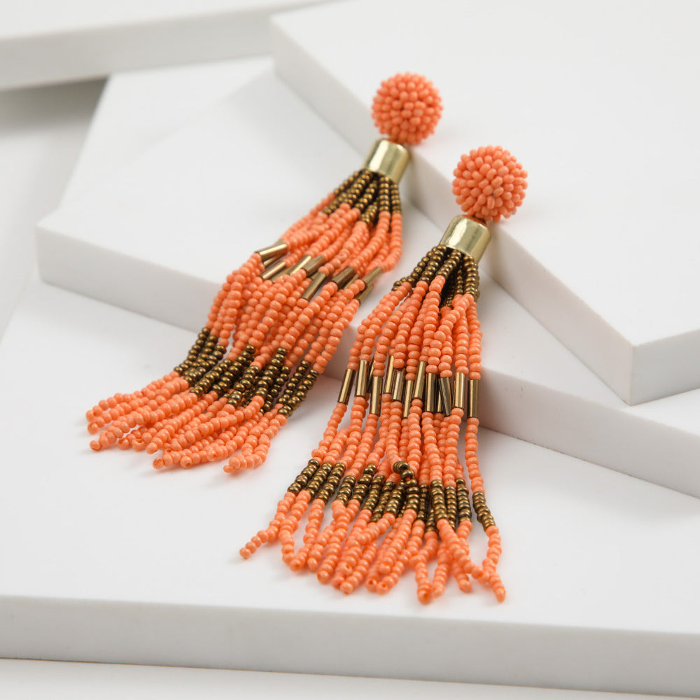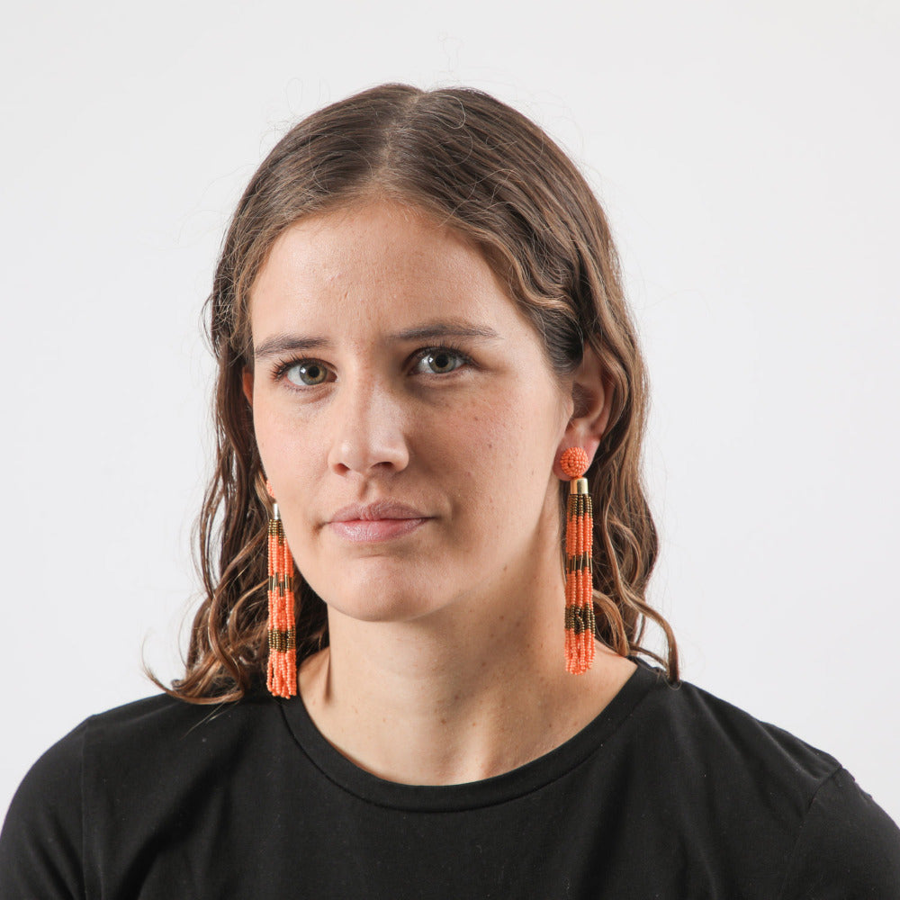 Aro largo de base redonda de mostacillas naranjas con fleco de mostacillas doradas y naranjas.
