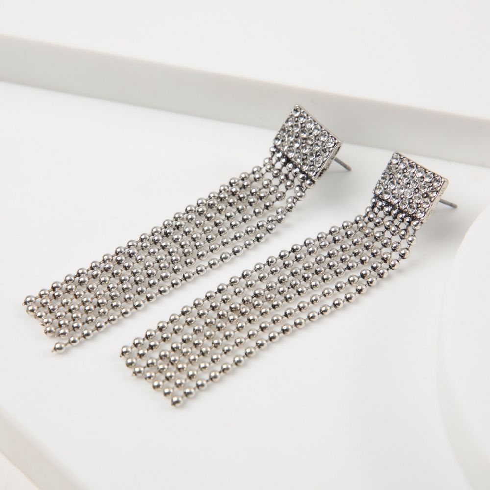 Aros colgantes largos plateados con brillantes de fantasía con cadenas colgantes.