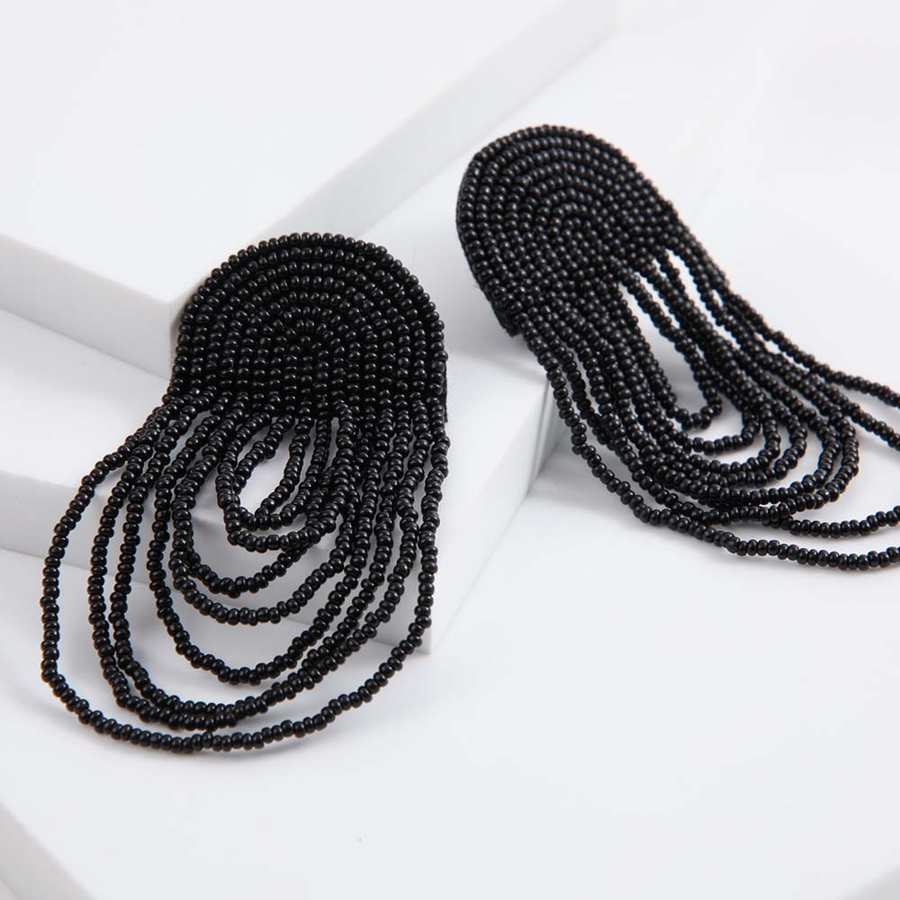 Aro formado por un semi circulo y tiras en Mostacillass de vidrio en color negro que van unidas a la parte superior del aro.