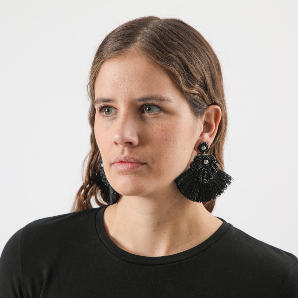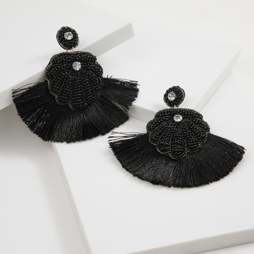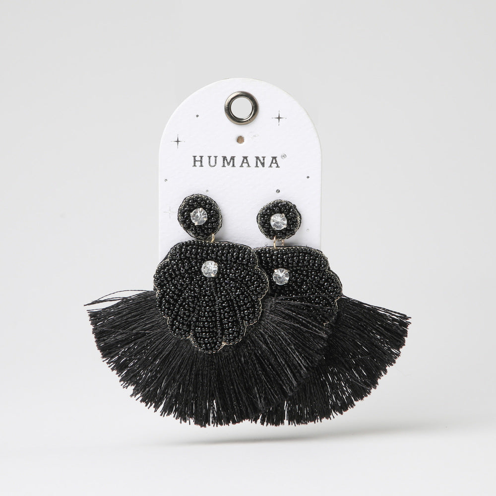 Aro colgante con de 2 partes con brillante de fantasía rodeado de mostacillas negras y flecos de hilo negro.